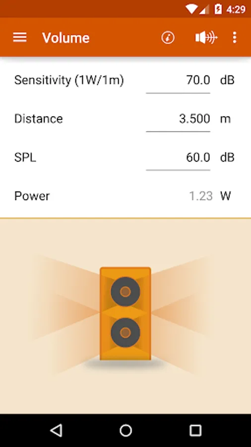 The volume tool helps you determine the amplifier power required for a given set of speakers.