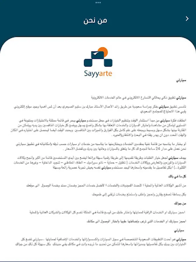 Sayaraty is the latest Saudi application specialized in the car market and its accessories and additional services to protect it. Sayaraty puts all the options in your hands with all its details, features and prices so that you can determine what you want while you are in your place and in your city with ease. My car is committed to providing an experience to the customer with unprecedented excellence and extreme accuracy