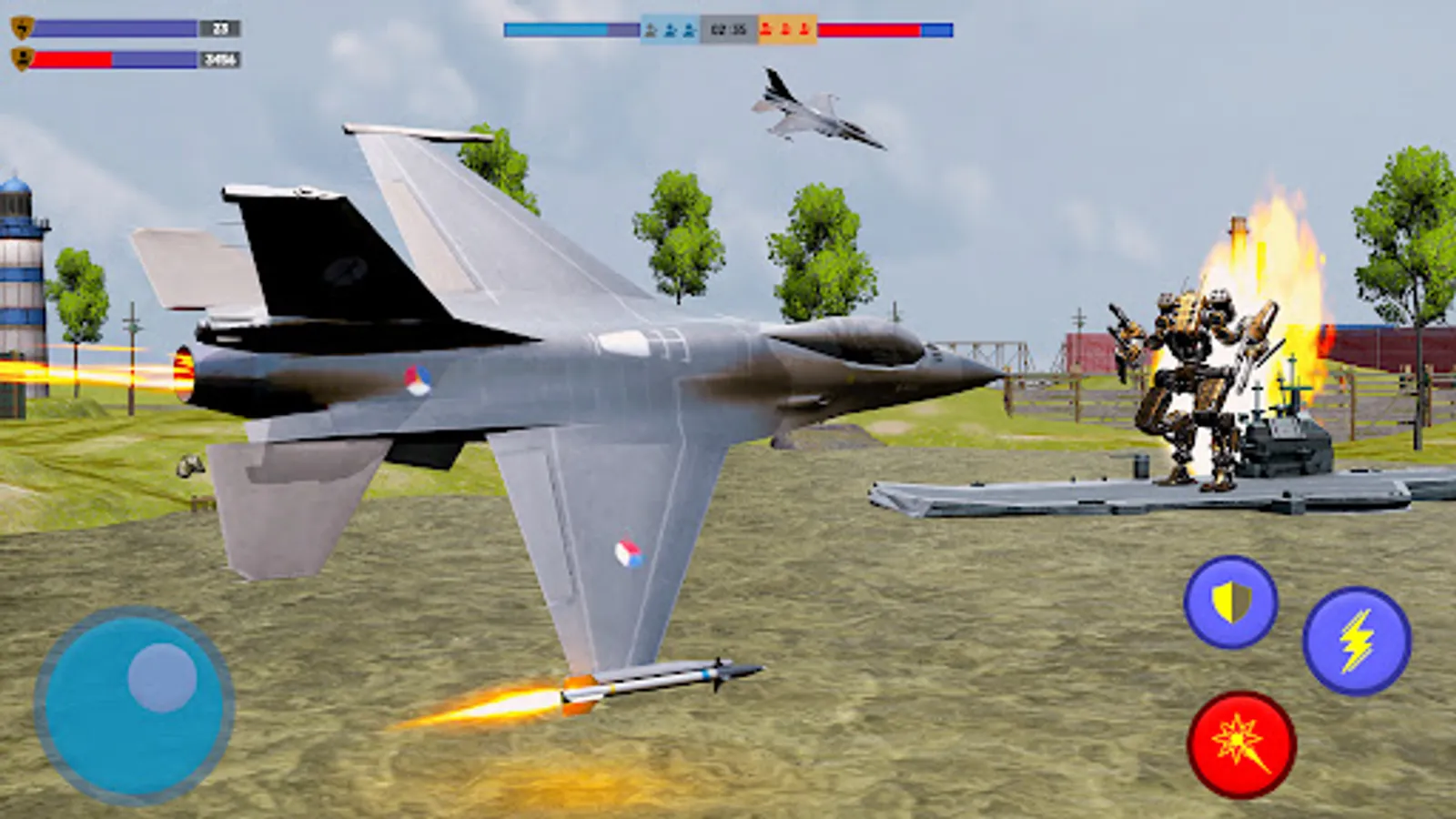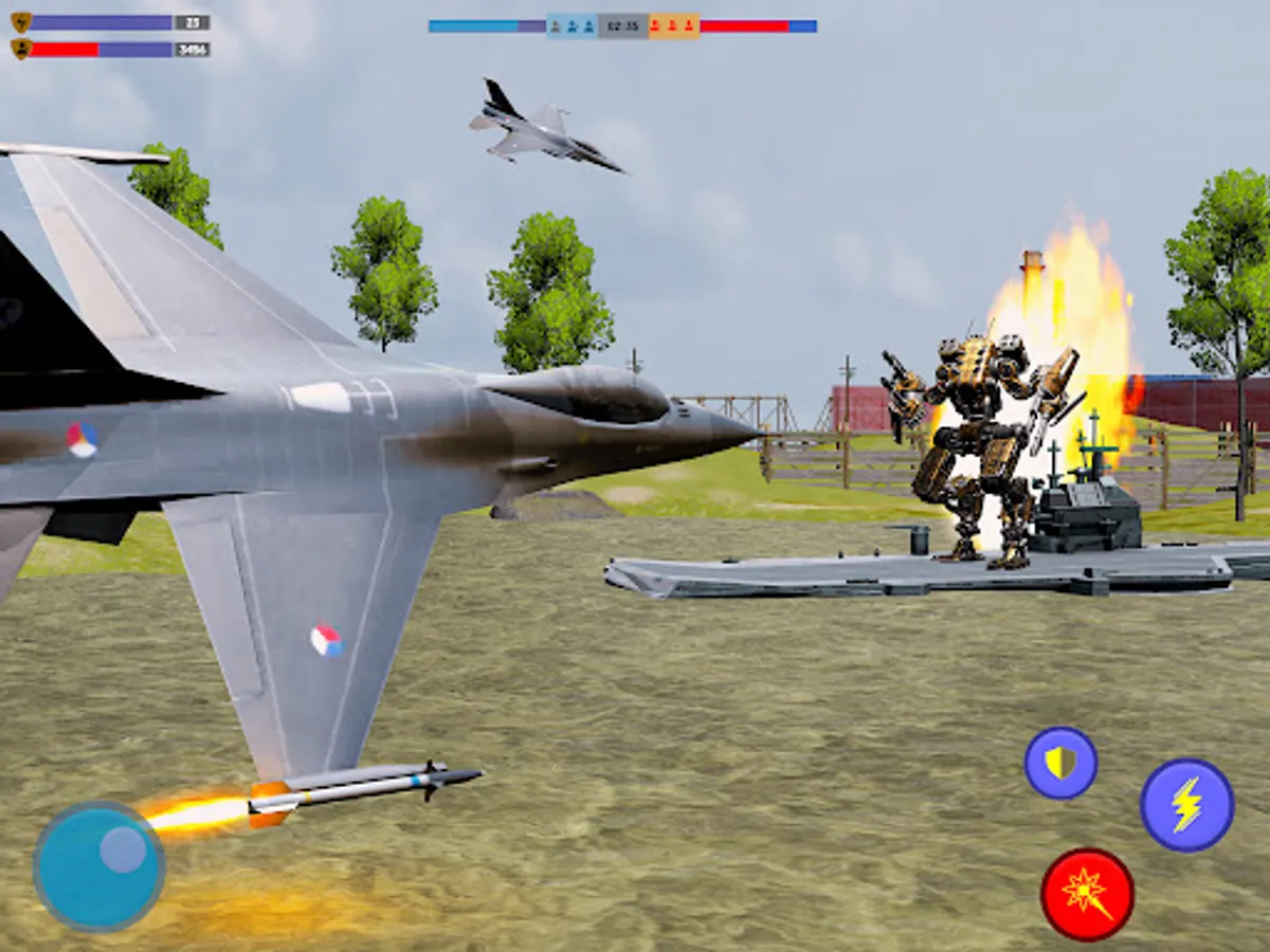 Jet fighters are made for air-to-air fighting combat with enemies aircraft. Some jets have properties to attack ground and some have to attack aircraft combat fighters. All the top features from all jet fighters like F15 Eagle, F16 Fighting Falcon, F17 Thunder, F18, F19 stealth fighter, F20 tiger shark, F21 forever are in one F22 Raptor Jet Air Fighter. You can easily enjoy all the fighting features in this raptor. Now F22 Raptor is under you and you have to fight against US army Robots to defend your frontline army airbase to defend your country. You must be aware this game is not an Air Jet fight transformation robot game, but you can still enjoy your time to play as a Jet Fighter Pilot. You have to fight against robots warships, static steel fighters robots, and flying steel futuristic robots. Robo warships are fully equipped with multilevel warfighting robot. I know you got bored from simple jet simulation games or simple jet fighting games or simple jet transforming simulation games, but this game is different one you can enjoy real feel of a jet pilot. US army robots are the army superhero warrior robots, now it's an open challenge for you to prove them false, complete your challenge and prove them wrong.