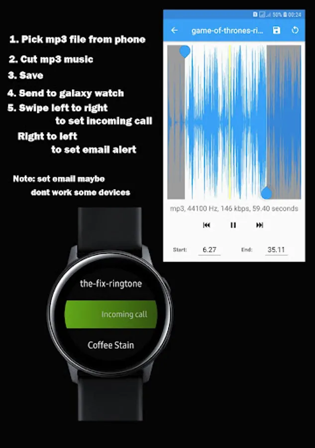 2. Cut mp3 file and save. Then auto send to galaxy watch