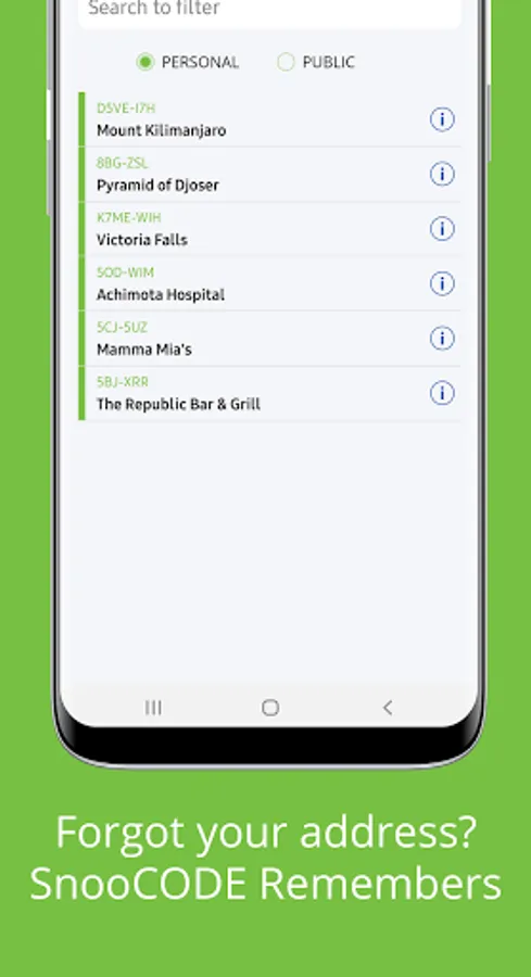 SnooCode Is the answer to the problem of a lack of addresses in huge swathes of the developing world. SnooCode allows you to obtain a private code that you can Share With General Public (e.g. Restaurant), Send Privately To Friends And Family (e.g. When Inviting Them To A Housewarming), Share With People You Need To Provide Services To You (e.g. Food Delivery and Where Applicable Police, Ambulance & Other Emergency Services)