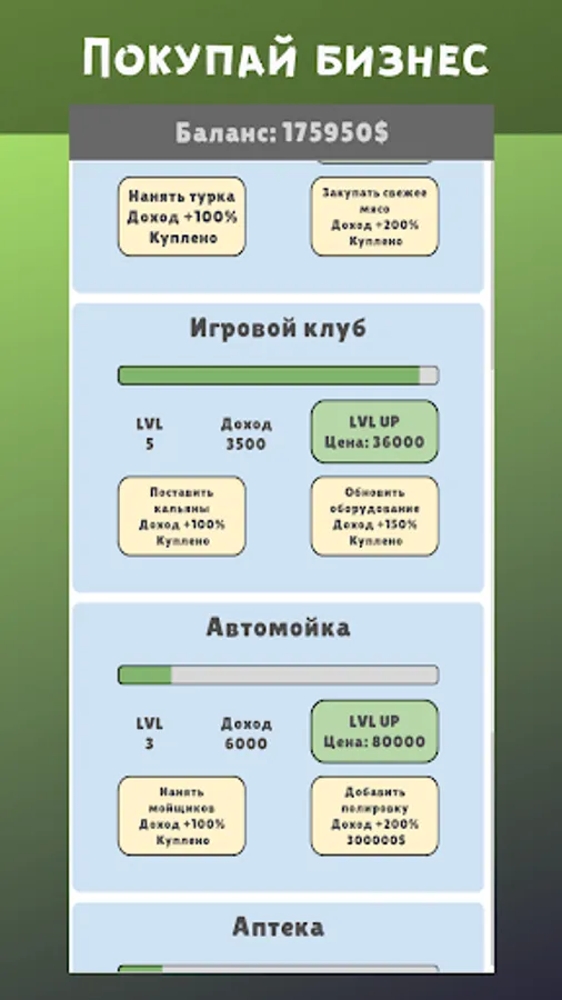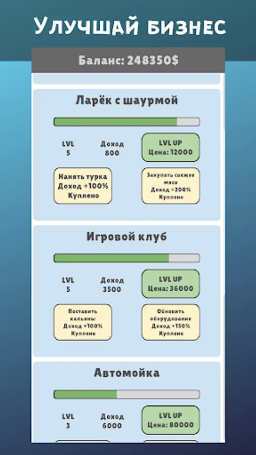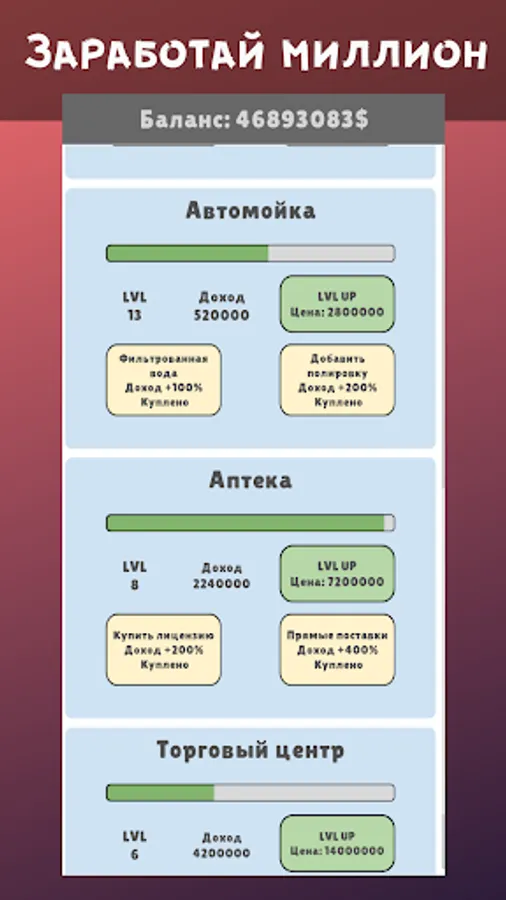 For each improvement of your enterprises, you will move to a new level. This will help you earn more and open a new business.