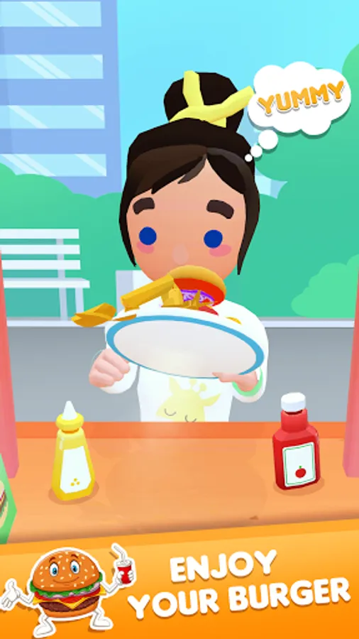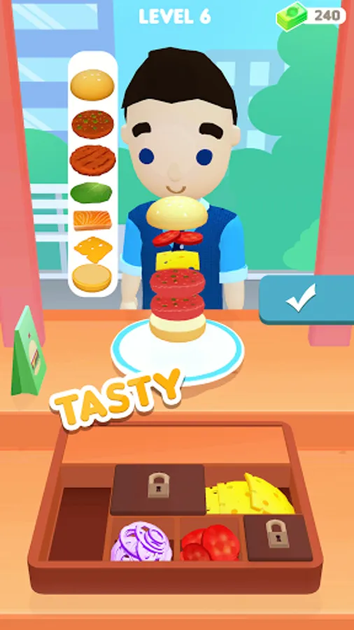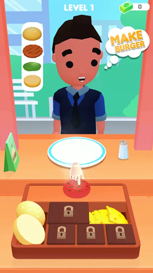 - Tap to cook, and Serve food & drinks on your burger stall.
