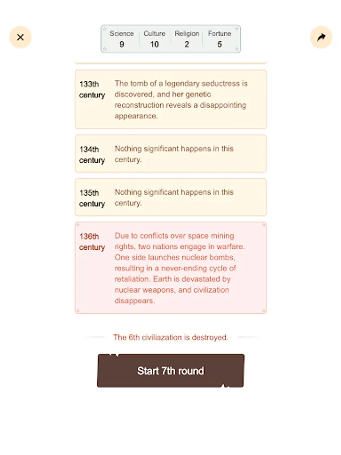 Control a journey of civilization in less than a minute! This game offers unlimited combinations of storylines with five distinct styles. From mythology to cyberpunk, you can indulge yourself anytime with a thrilling and satisfying experience!
