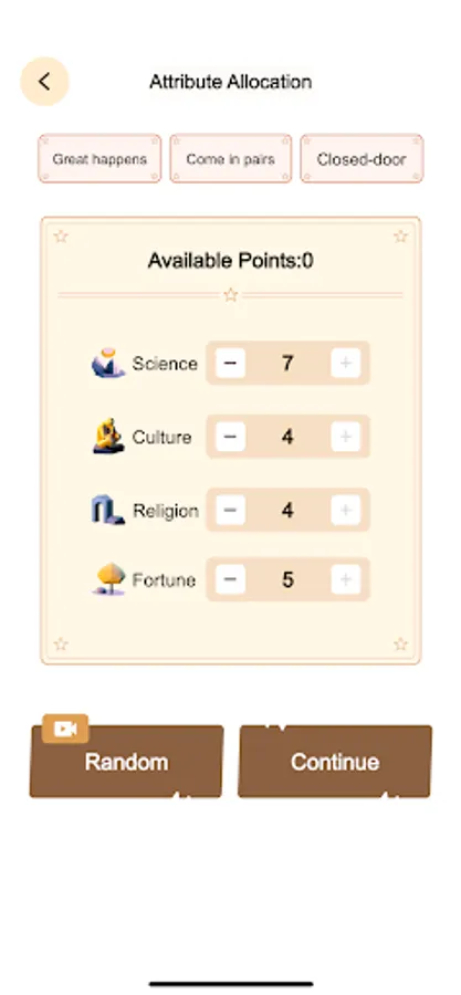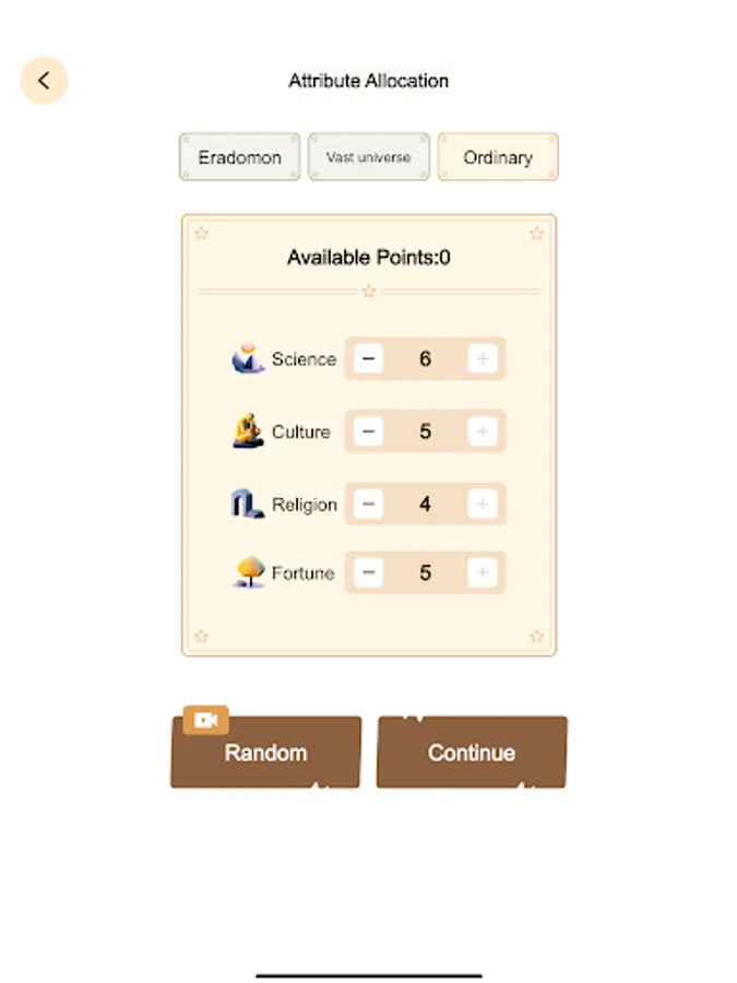 Step 2: Allocate your attributes wisely during the creation. For example: Science 6, Culture 6, Religion 3, Fortune 5 - together, let’s build the ultimate civilization!