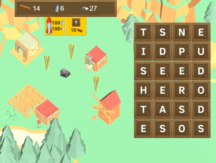 A mix of word puzzles and resource gathering. Collect resources to gain abilities and level up.