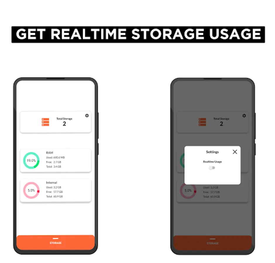 🔥 Realtime Usage: shows real time usage of ram, internal, external storages.