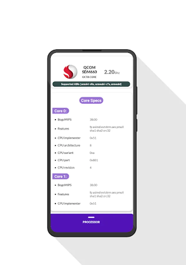- Processor: system on chip name, architecture, cpu revision, cpu features, core specs.