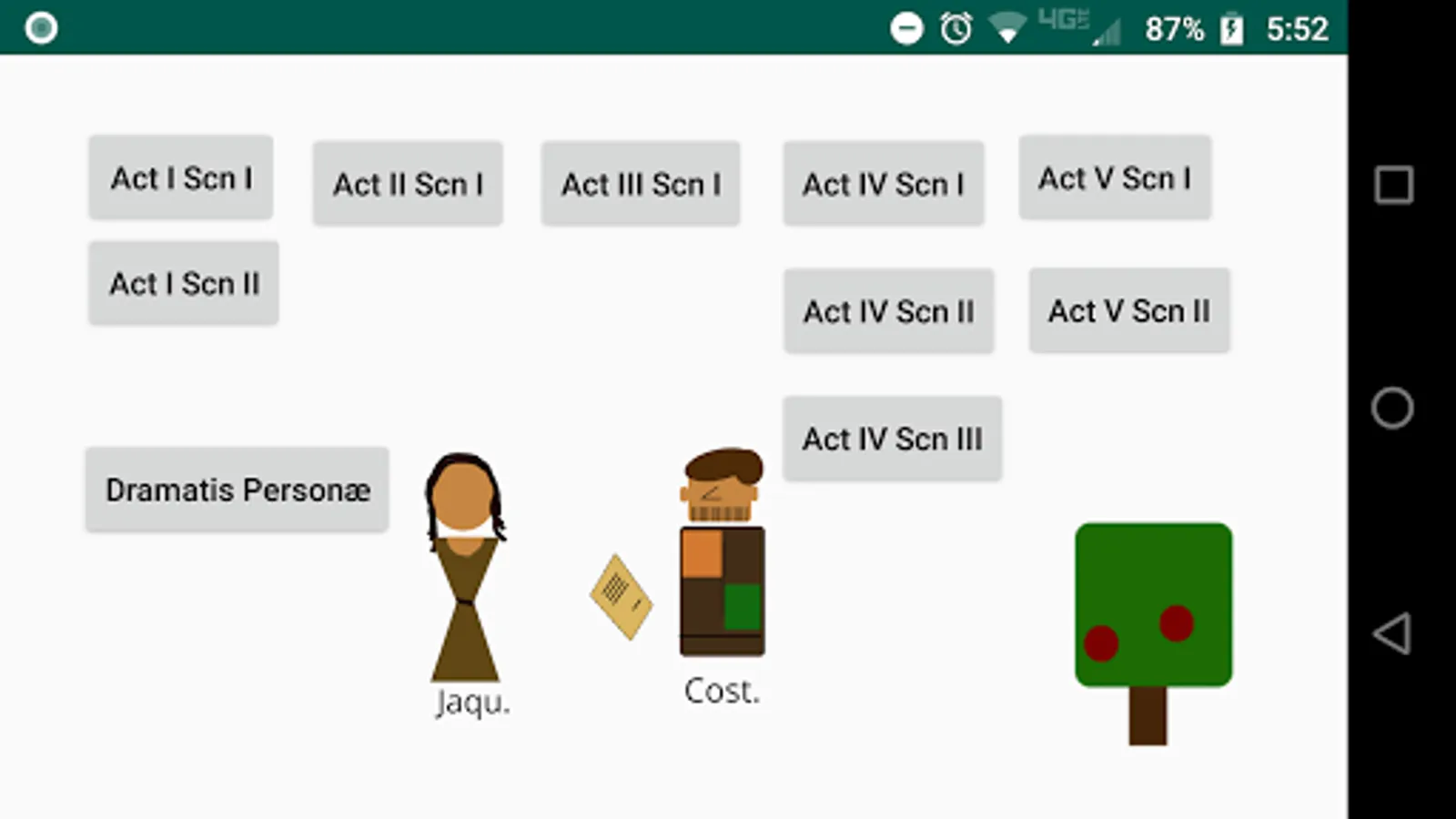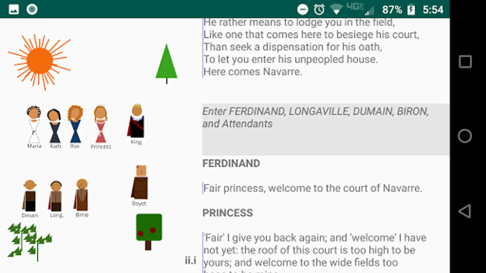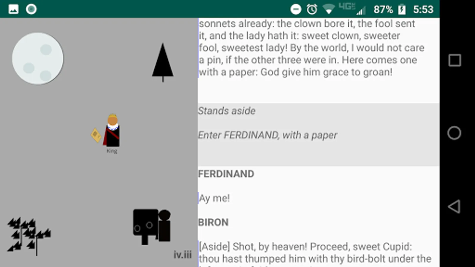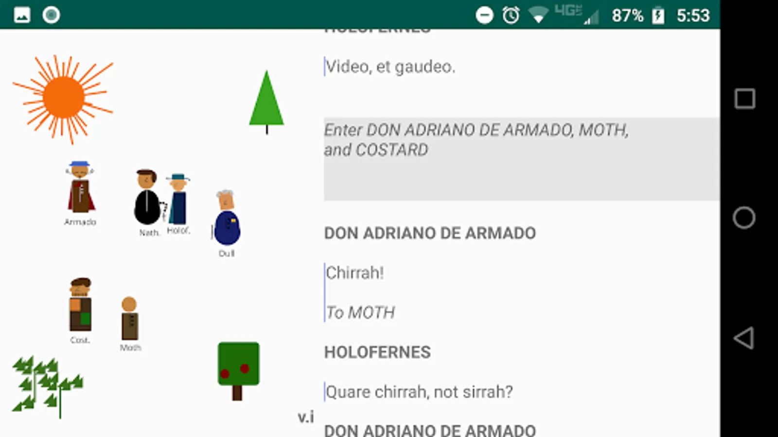 The play's the thing! As you read the play, tap the stage directions and see the little players make their entrances and exits. Helps keeps track of who is on stage. There is very little animation, so as not to distract from the words, which are what really matter. These actors have very limited range, but they stay in place and set the scene while you read.