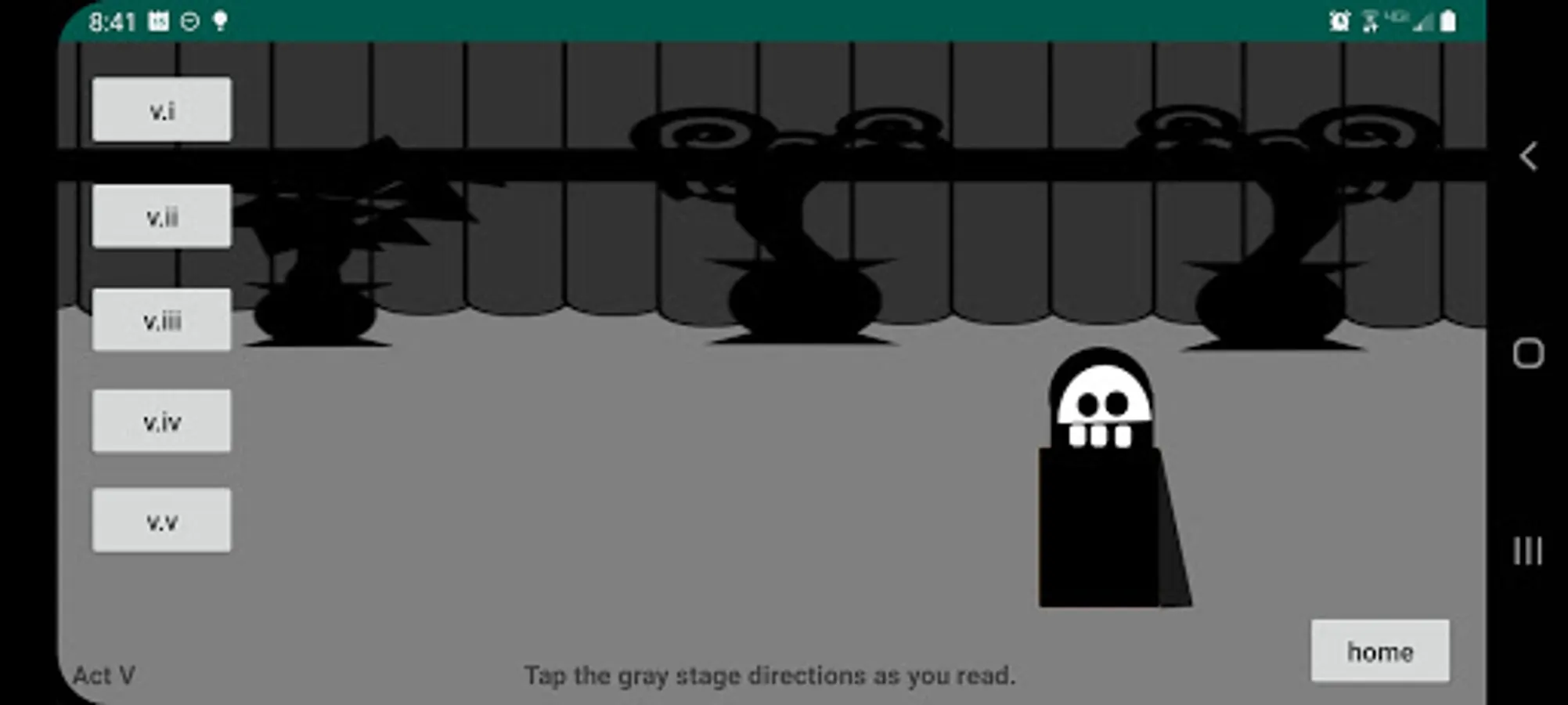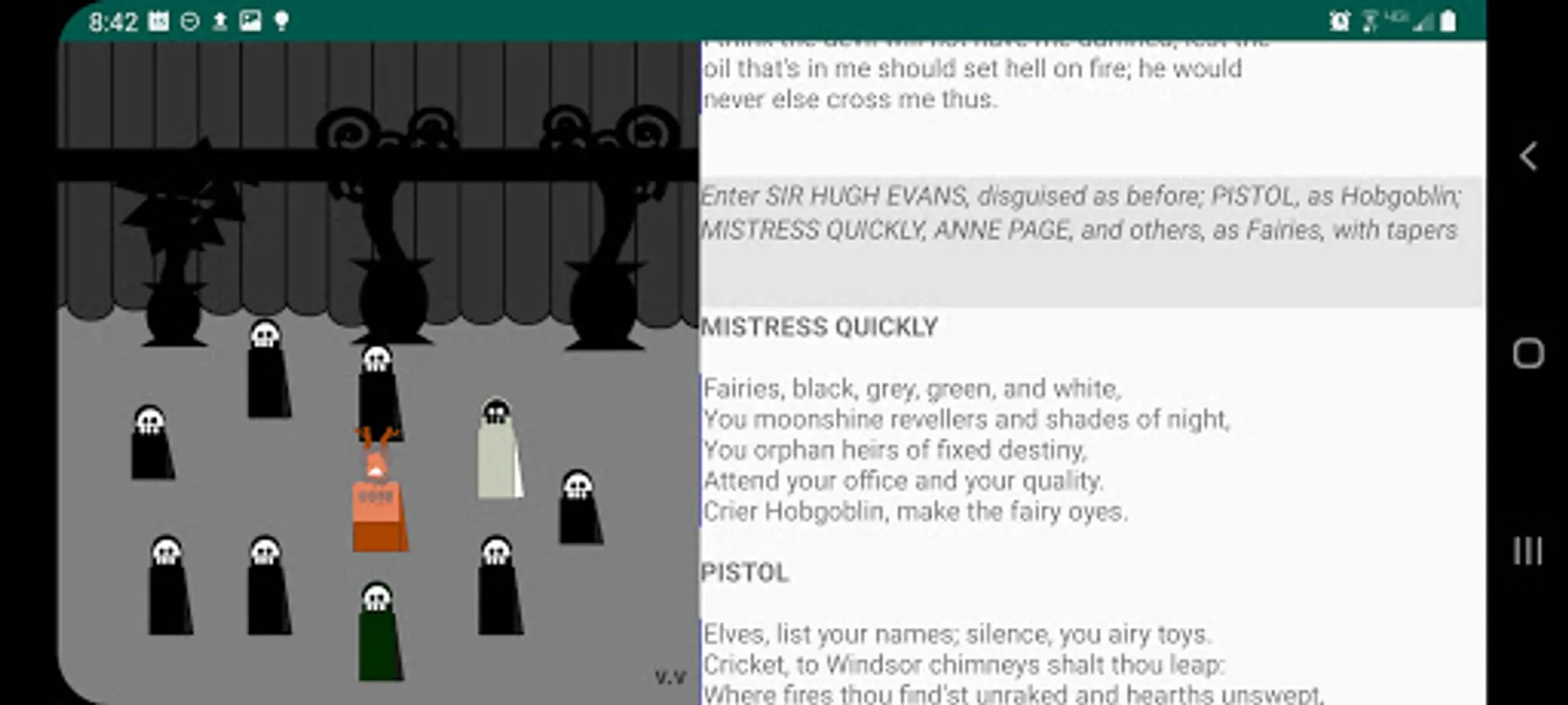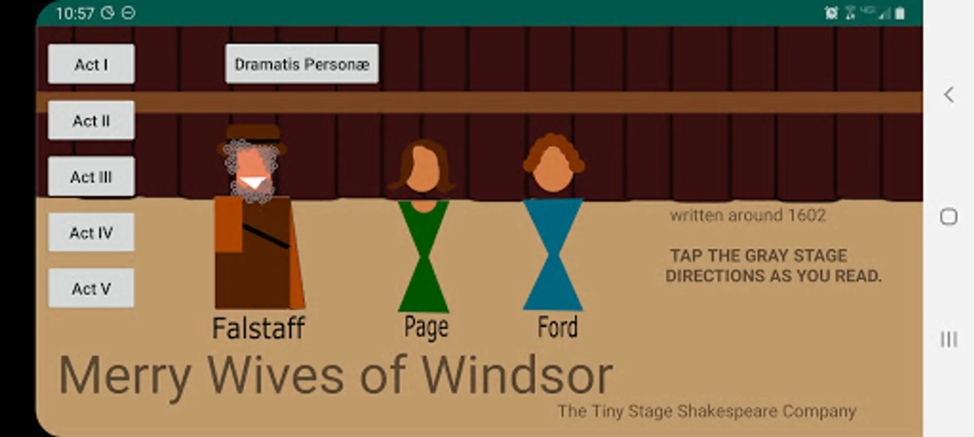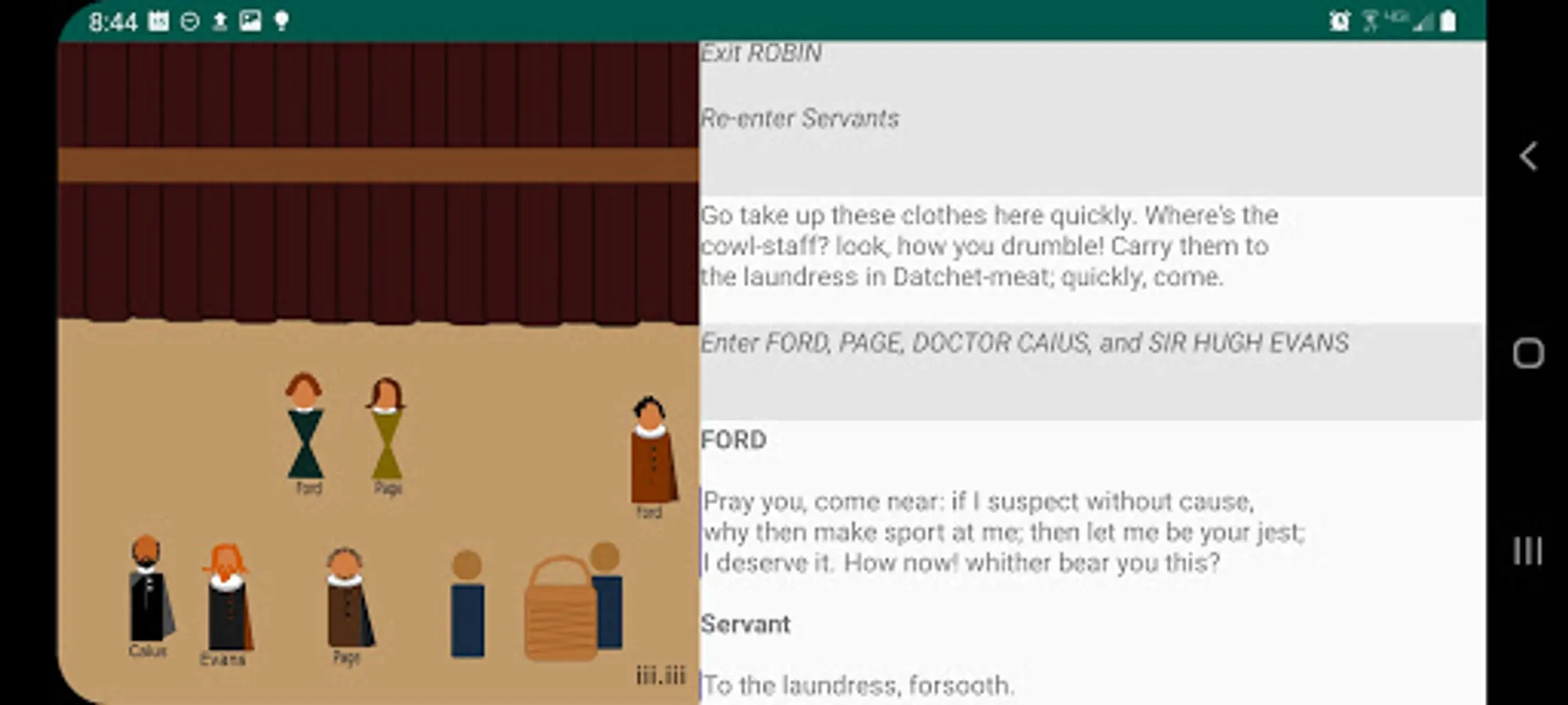 The play's the thing! As you read the play, tap the stage directions and see the little players make their entrances and exits. Helps keeps track of who is on stage. There is very little animation, so as not to distract from the words, which are what really matter. These actors have very limited range, but they stay in place and set the scene while you read.