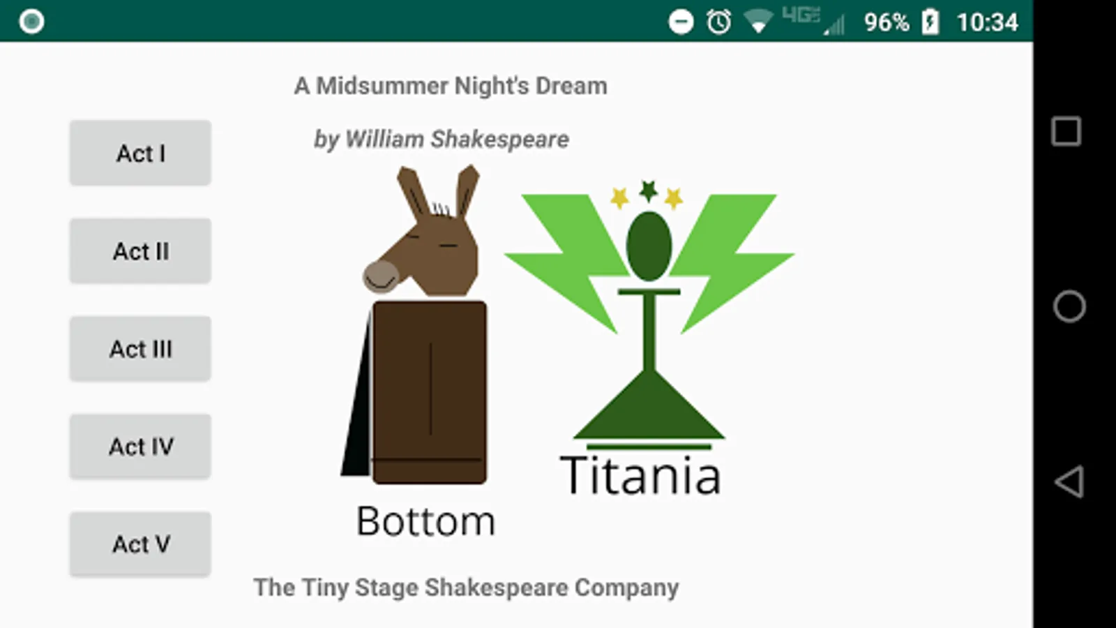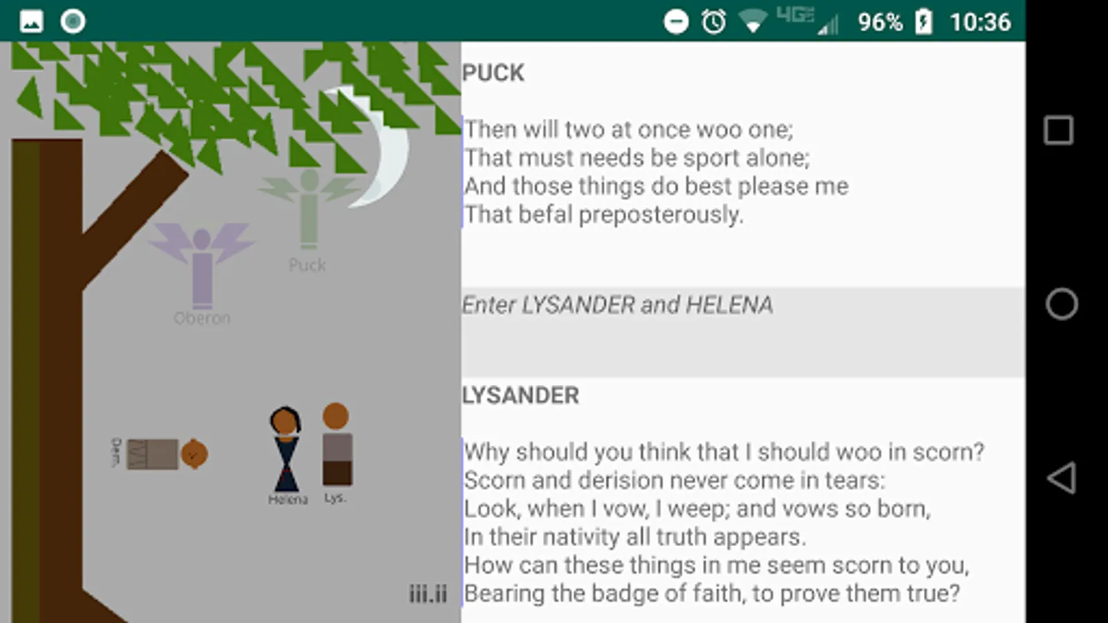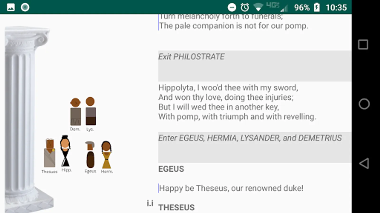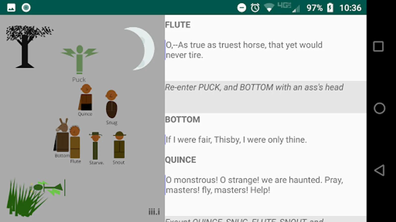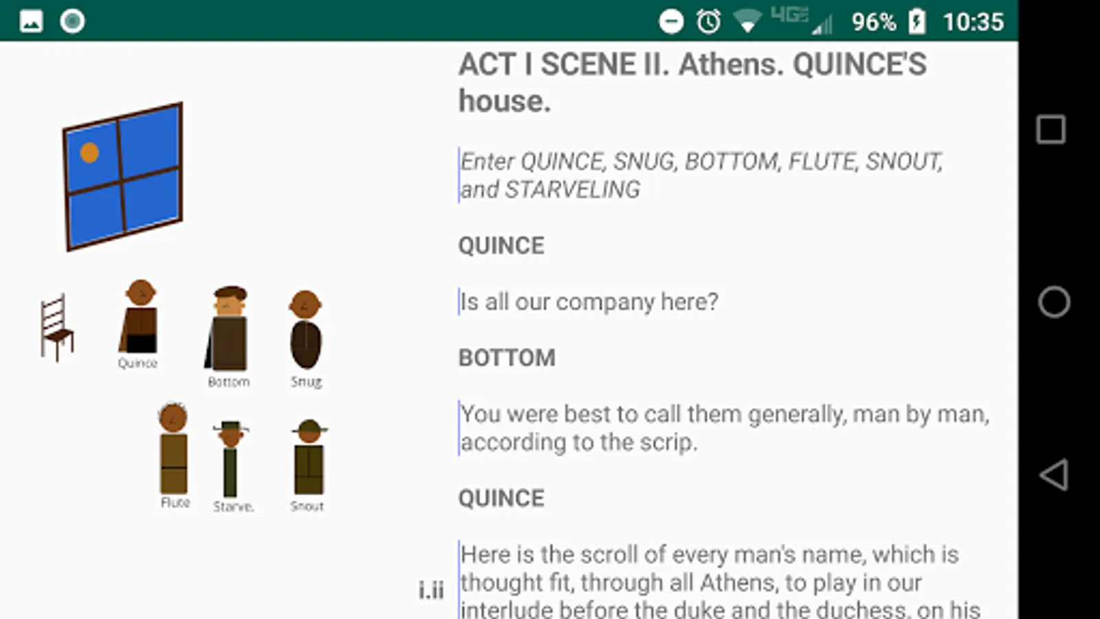 The play's the thing! As you read the play, tap the stage directions and see the little players make their entrances and exits. Helps keeps track of who is on stage. There is very little animation, so as not to distract from the words, which are what really matter. These actors have very limited range, but they stay in place and set the scene while you read. No ads!