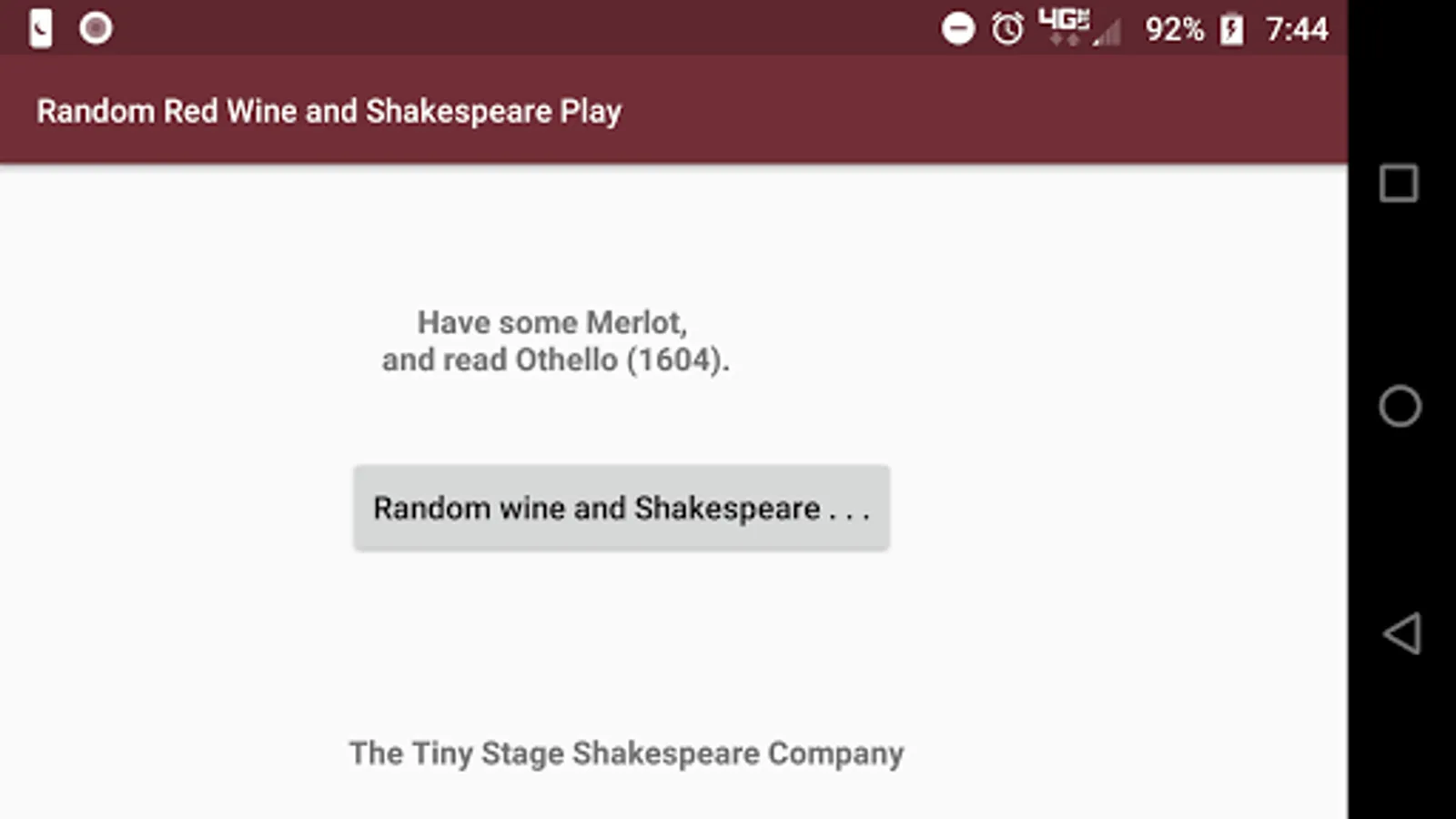 Ever have a hard time picking the right wine and reading material? Not anymore! With the press of a button, get a suggestion on what to drink (red wine) and what to read (Shakespeare). That's all it does.