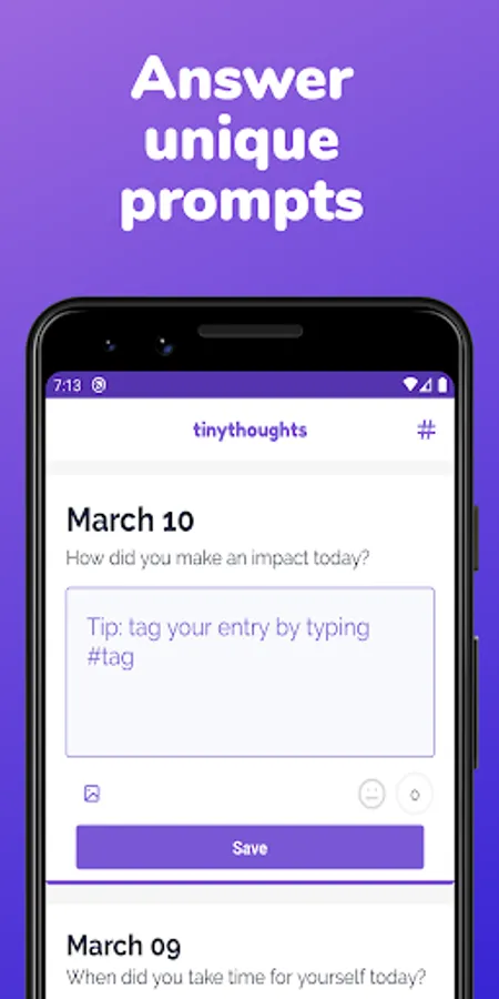 🟣Answer prompts. Can't decide what to write today? tinythoughts has a new prompt for every single day of the year.