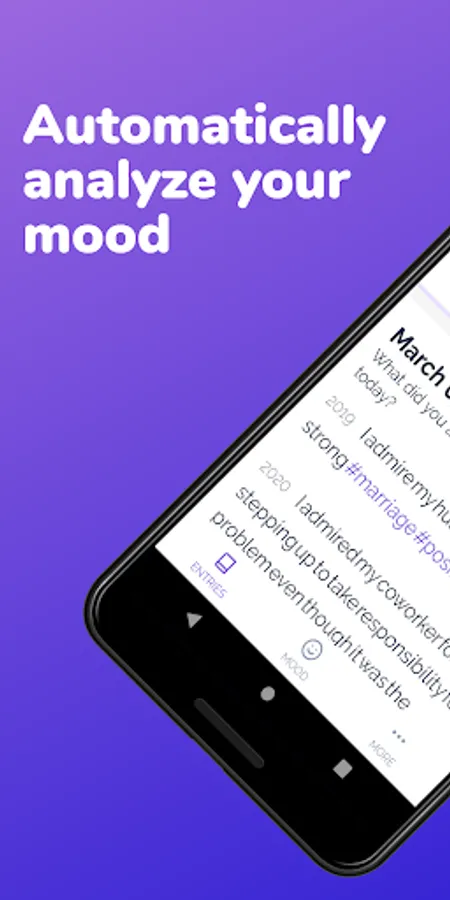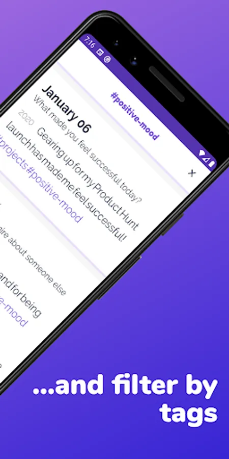 🟣Track and filter your daily mood, and view trends over time. tinythoughts automatically analyzes your mood basted on the text in your entry, and adds the corresponding #positive-mood or #negative-mood tag