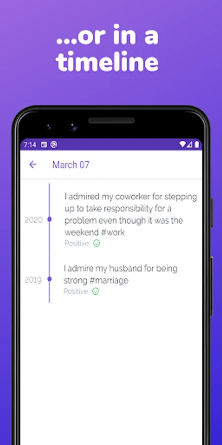 🟣View relevant entries from the past. tinythoughts groups your entries by date instead of by year, so you can see what you posted on January 1, 2019 next to your post from January 1, 2020!