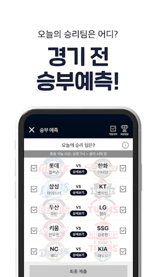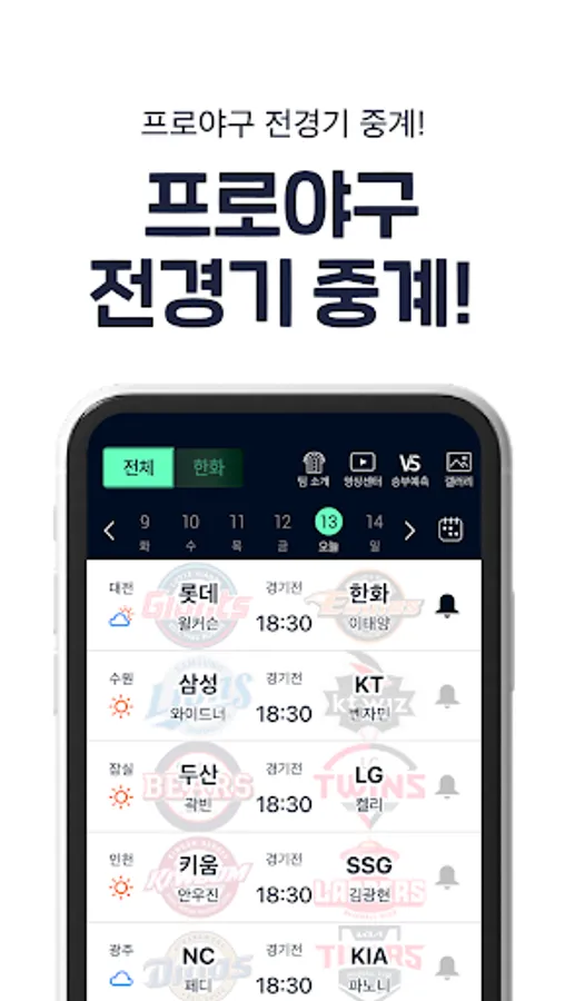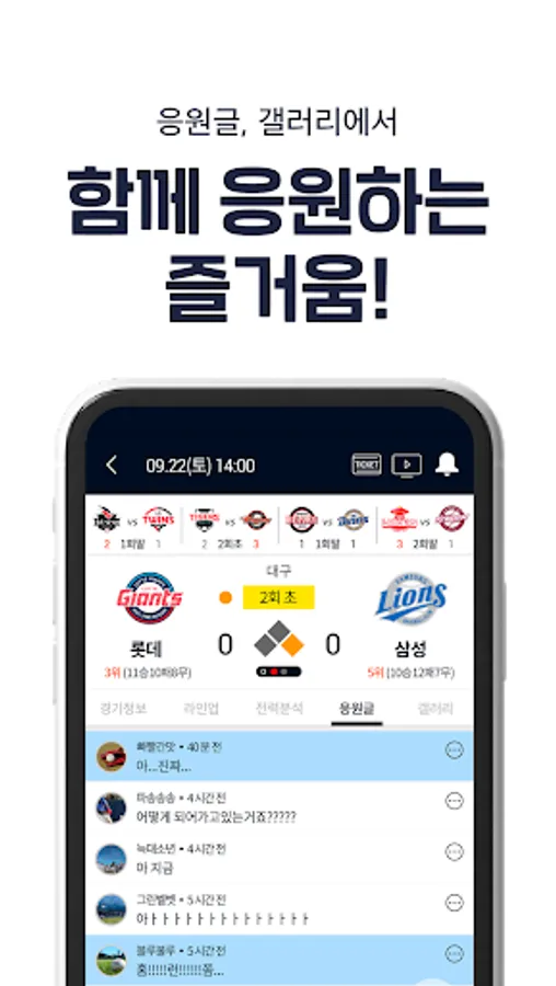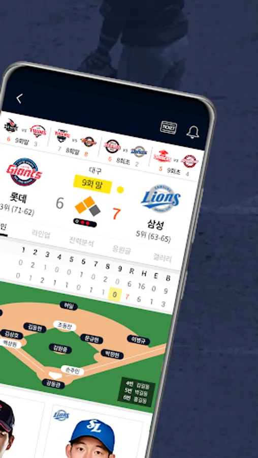 You can check all game real-time scoring and various information such as schedule, standings, news, SNS news, and weather.