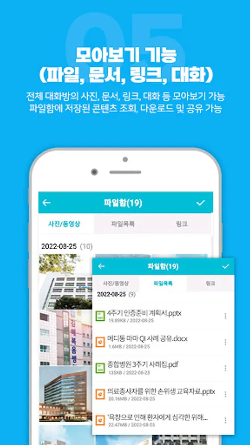 • View, download, and share photos, documents, links, etc. of the entire chat room with the file box collection function.