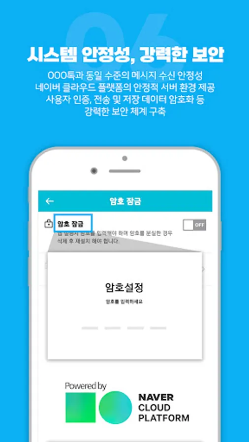 It is a safer and more reliable messenger by providing a stable server environment based on the NAVER CLOUD PLATFORM and establishing a strong security system such as user authentication and encryption of transmitted and stored data.