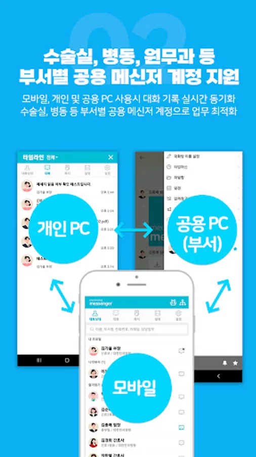 By supporting shared messenger accounts for each department, such as operating rooms, wards, and administrative departments, real-time synchronization of conversation records is possible even when using multiple devices.