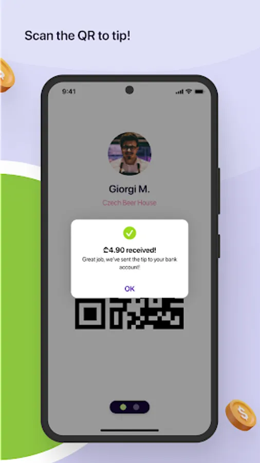 Receiving gratitude is even easier and just requires you to open an app and show the QR code to the customer.