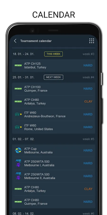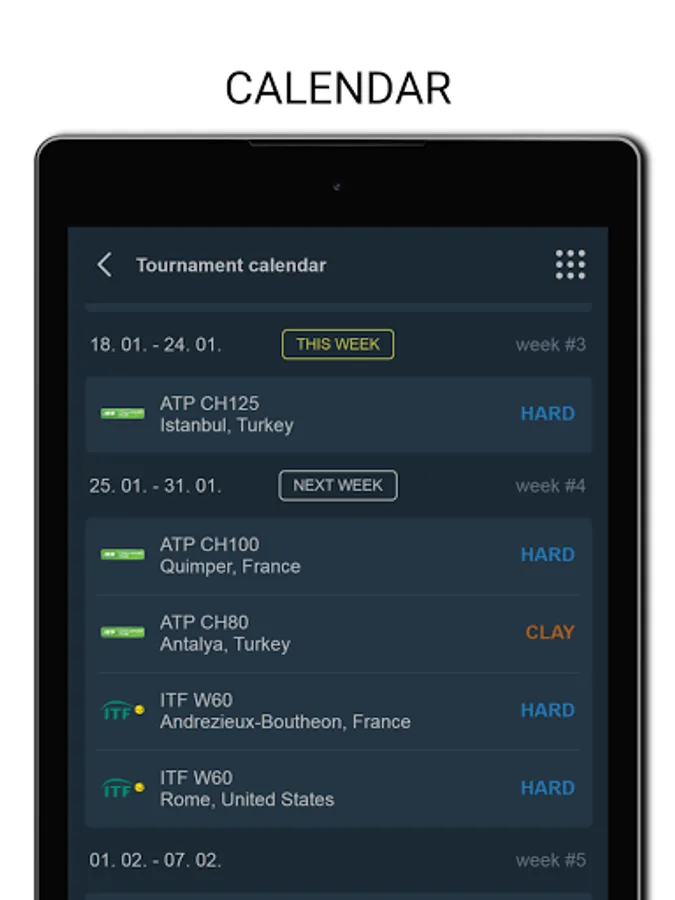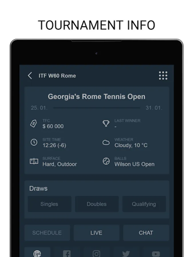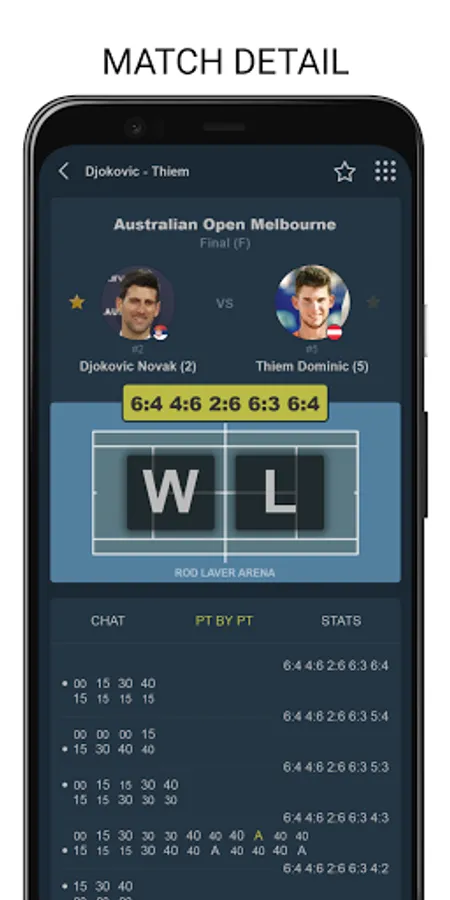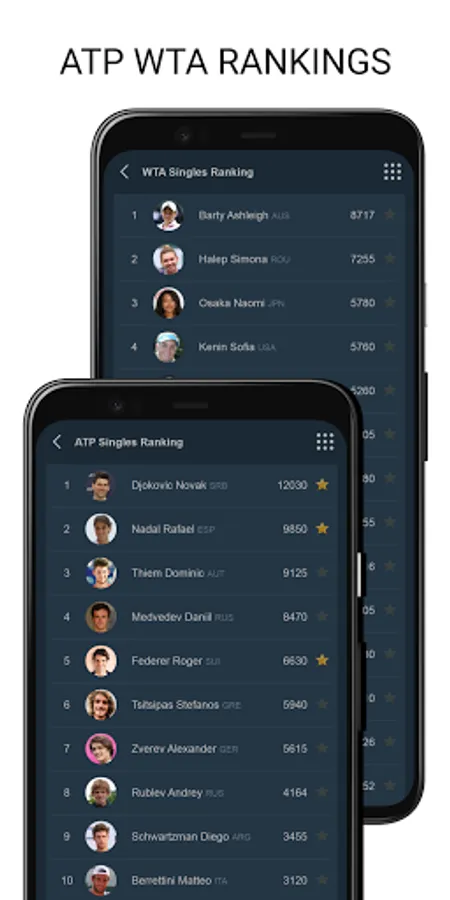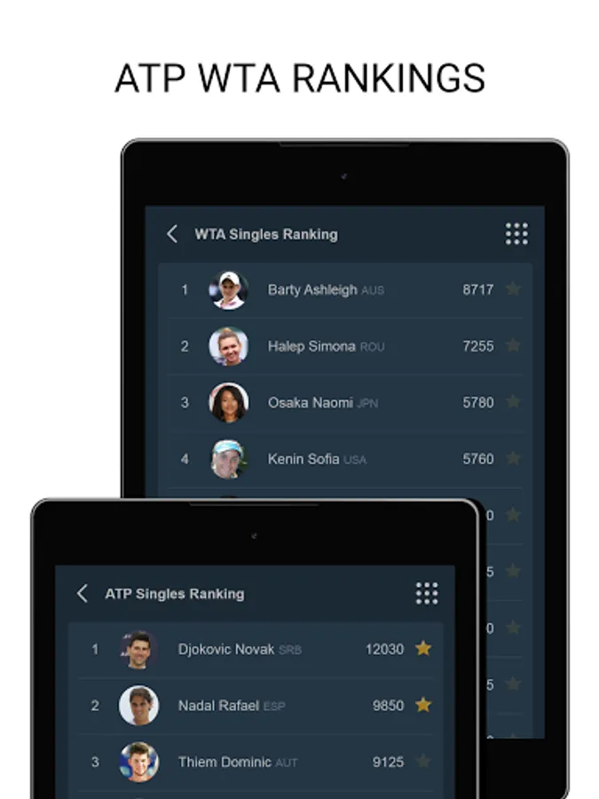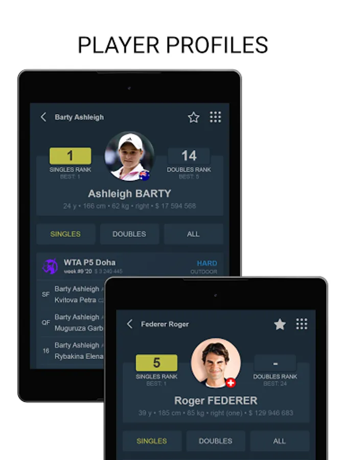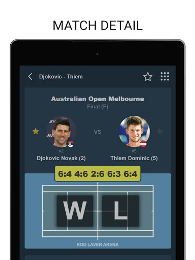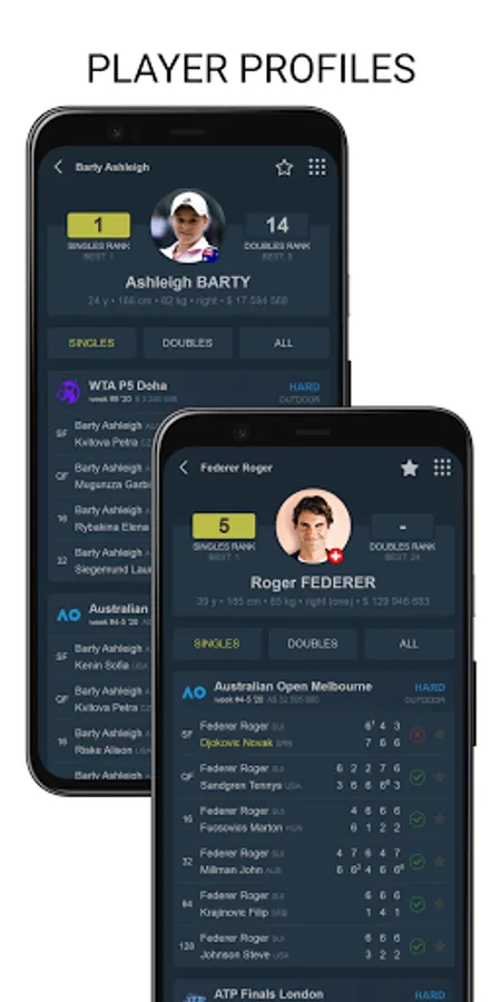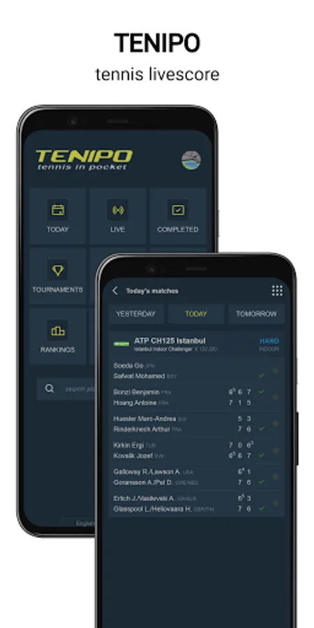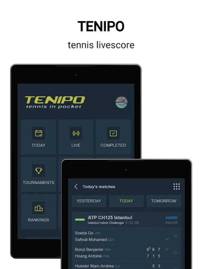 Tenipo offers live score services from a huge number of tennis tournaments all around the world. You can find here livescores from the Grand Slams (Australian Open, Roland Garros, Wimbledon and US Open) as well as from tournaments of category ATP 1000, ATP 500, ATP 250, ATP Challenger, WTA Tour and ITF events. You can check here livescore from Davis Cup and Fed Cup ties, too. Tenipo gives you a chance to follow live score services and results of the biggest tennis stars as Rafael Nadal, Roger Federer, Novak Djokovic, Serena Williams, Naomi Osaka, Angelique Kerber etc. Add them to your list of favourites and be informed of every match they play. Use the possibility and get notifications about your selected match - when it is started, when the set is over, who is the winner. Tenipo also brings you the possibility to check the statistics of the matches.