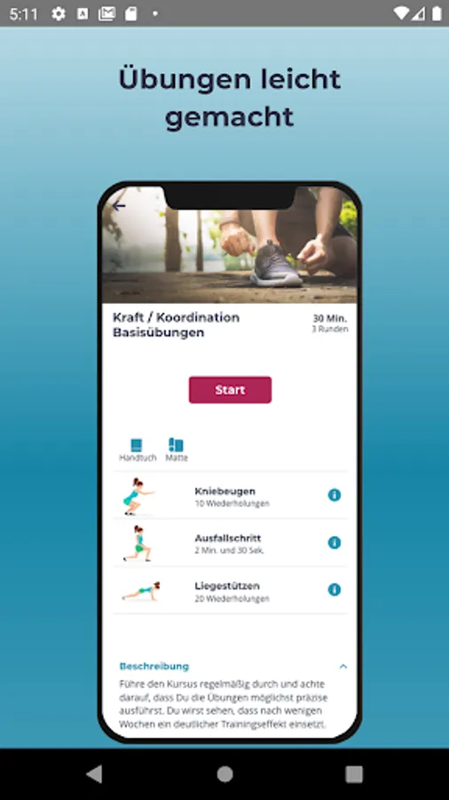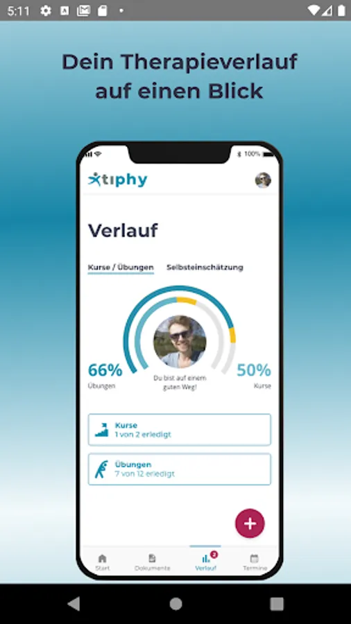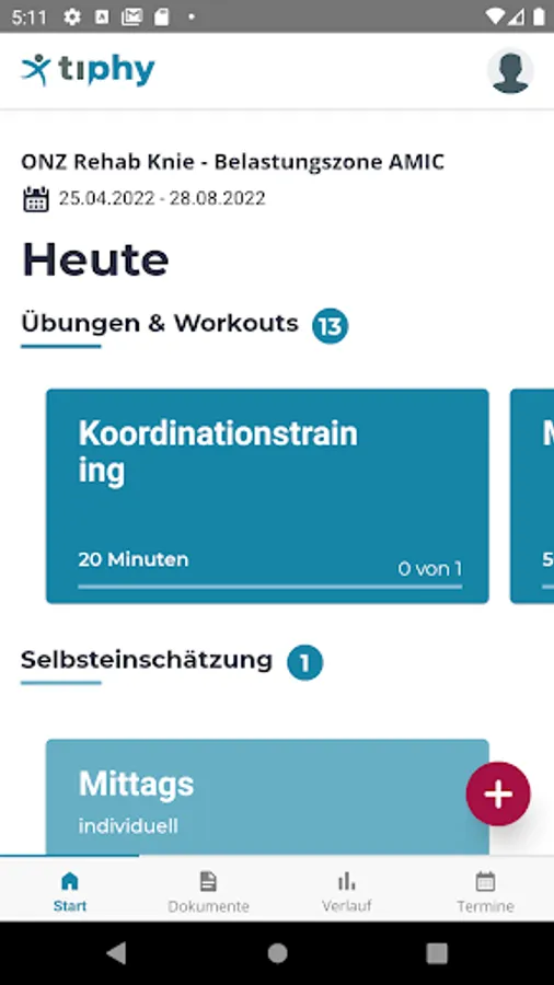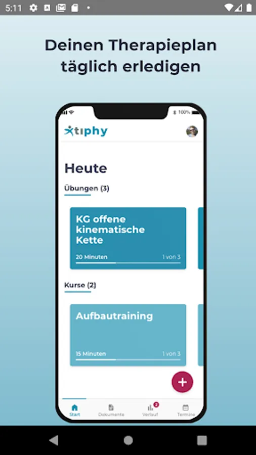 The therapy plan is then transferred to the patient's tiphyHealth® patient app so that the patient can start his therapy directly. He is shown his current exercises every day and is prompted to carry out measurements and recordings if necessary.