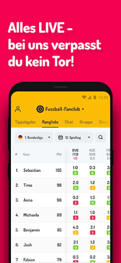 All ranking lists and scores are calculated live at tipplay. If a goal is scored, everything changes immediately! This not only gives you a betting game, but also a football live ticker, with which you won't miss a goal again.