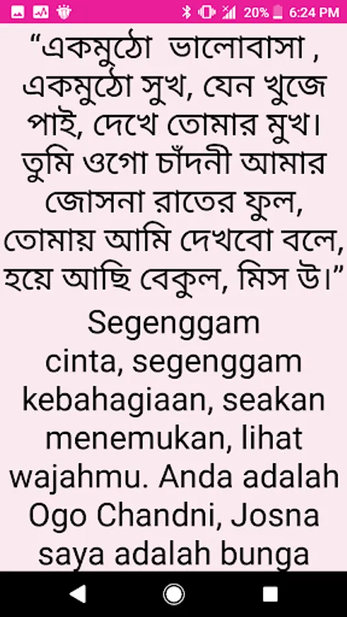 Get up with your prisoner. From now on we will talk for 24 hours. We have decorated our app with different types of romantic stories. From Bangla language to Indonesian. Select the text of your choice and share it directly with the prison. Service: # Indonesian message from Bengali # Bengali message from Indonesian we hope will benefit from using this epoxy Thanks