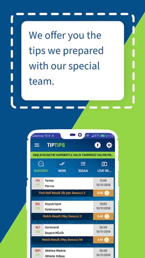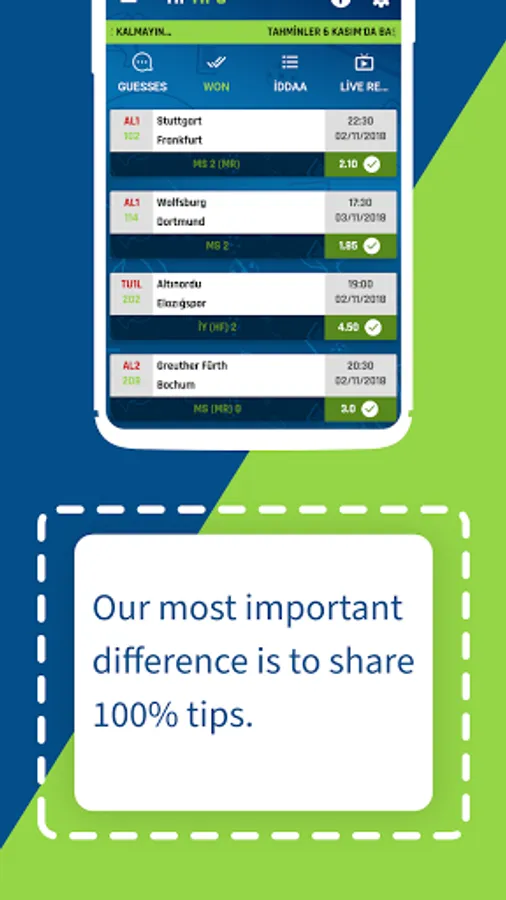 You can follow live matches and access the whole match list with the daily match bulletin. In addition, we inform you of all our matches with notifications and share them in the predictions section.