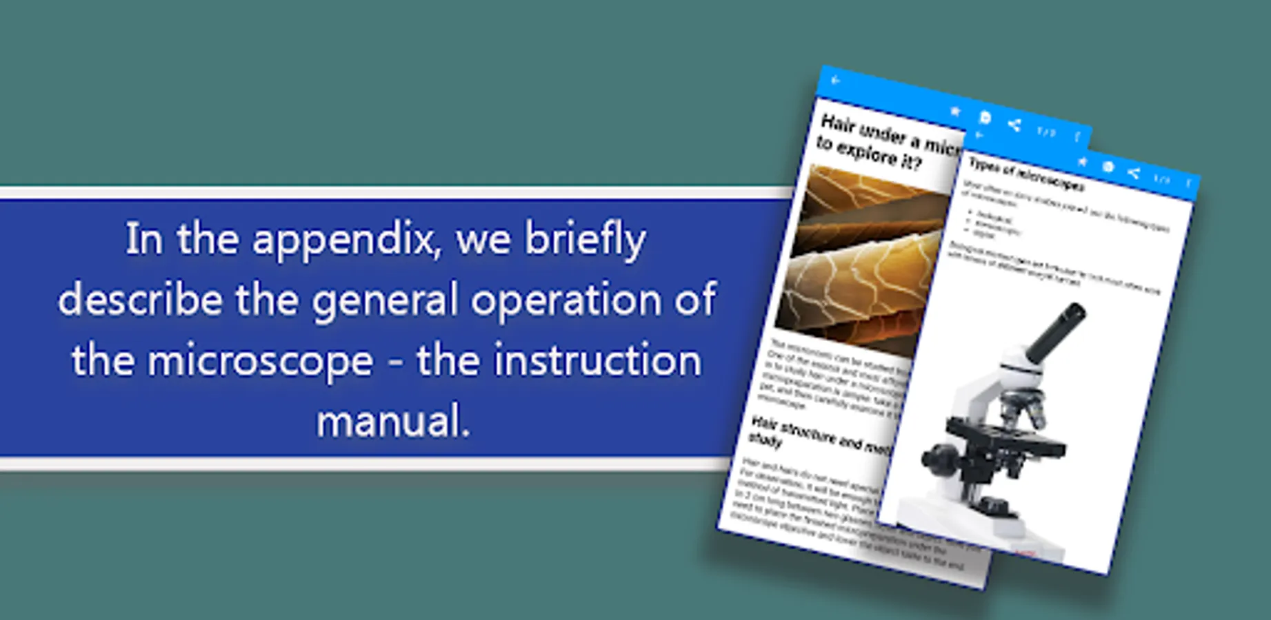The application "Instructions on how to use a microscope" for Android will allow you to easily and simply study the microscopic study of microbes, bacteria, cells and other small objects. With this application, you will be able to master all the basic tools and techniques for using a microscope, as well as access the latest news and innovations in this field. The app will help you learn how to use a microscope to study germs, bacteria and other small objects on your phone or tablet. You can also use it to study cells and other small objects. The app lets you familiarize yourself with different types of microscopes, including digital microscope, magnifier microscope, handheld microscope and more. You can also use a microscope to examine the skin, check for bacteria and other small objects. The app also offers a microscope mode that allows you to view small objects at the highest possible resolution. You can download the app to your phone or tablet and start using the microscope to examine microbes and other small objects. The application will give you the opportunity to choose the best microscope for your research and study. With Microscope Instructions app, you will be able to properly use the microscope to study small objects and get the most out of using the microscope. Install Microscope Instructions for Android app and start using microscope to study microbes, bacteria, cells and other small objects. Install the app and start using the microscope to view germs and other small objects. Download Microscope Instructions app and start using your Android microscope to study germs, bacteria and other small objects. The application offers a simple and clear guide to using the microscope to study small objects and get the most out of its use. Install the app and start using the microscope to examine germs, bacteria, cells and other small objects.