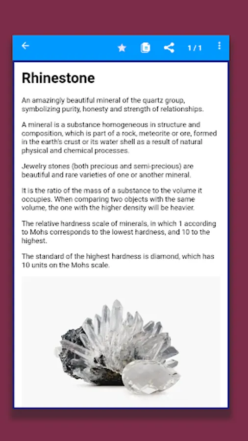 "Minerals and Stones" is a useful application for lovers of geology, gems and minerals. You will be able to learn more about rocks and minerals than ever before. Our application will help you get acquainted with stones and minerals thanks to a photo search, a handy guide and an interesting book. You can learn about runes and runic formulas, look at the atlas of stones, find out information about gems and crystals, as well as crystal magic.