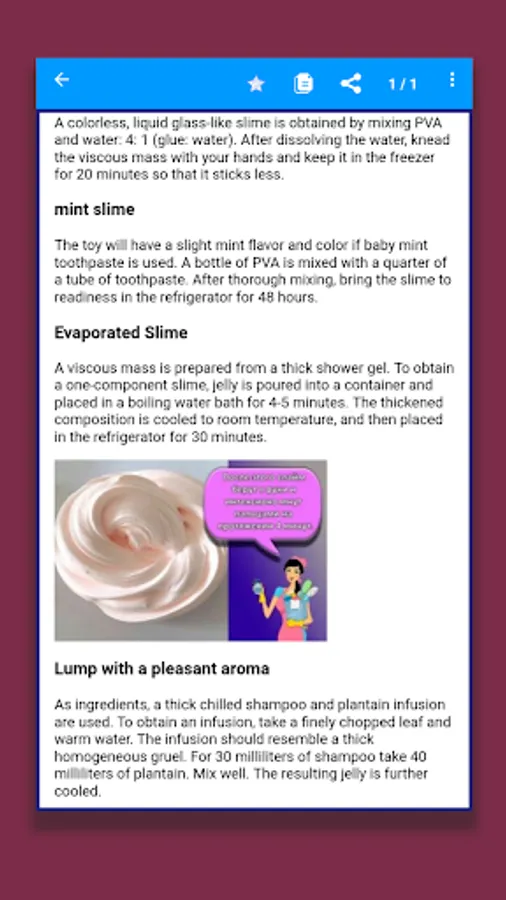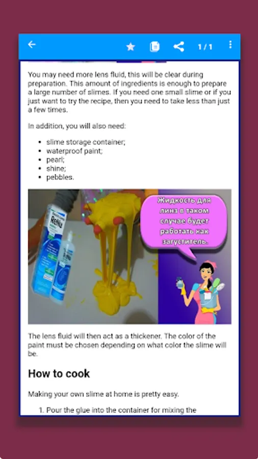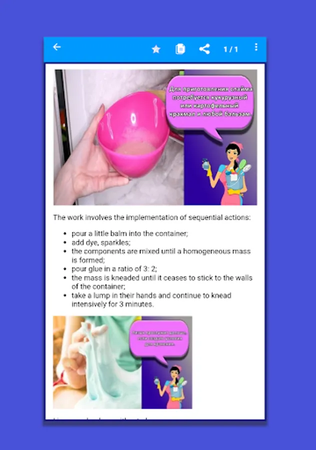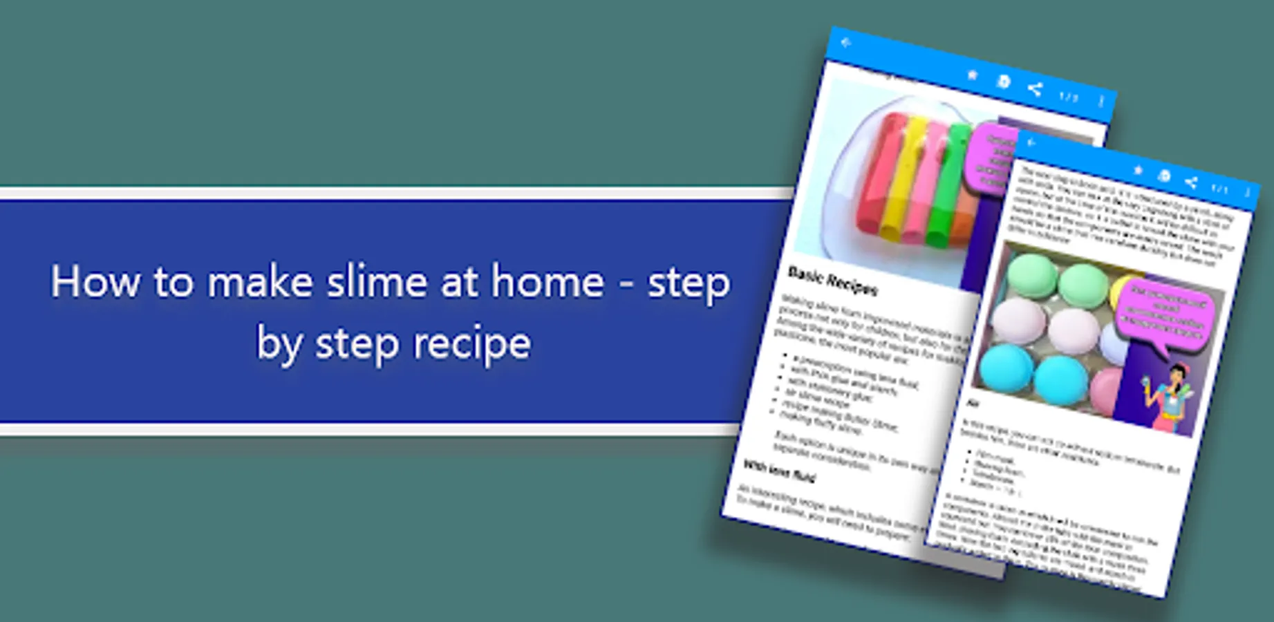 With the application "How to make slime" you can learn the intricacies of slime makeup. You can use the app to view recipes, tutorials, and slime preparation tips. Our application will help you master the art of slime makeup and learn how to make slimes for yourself, without the participation of professional masters. You can also use this app to track the evolution of the slime and how it evolves over time. Even if you're offline, you can use the app to view information and get recommendations for your slime experiments.