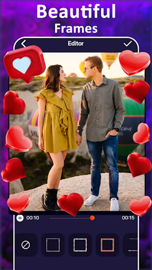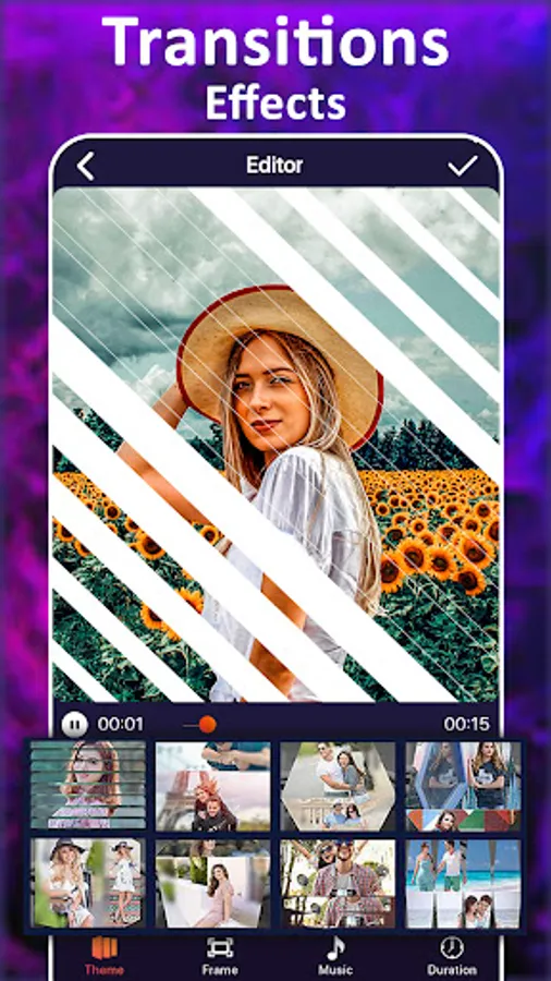 photo video maker with music effects for pictures also has lots of great transition effects and picture frames to create photo videos. Transition creates great animations between two images. Photo frames with many creative themes suitable for your video. The videos you make from photos and music, photos that make up videos look better with effects and frames.