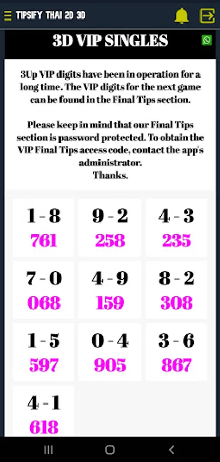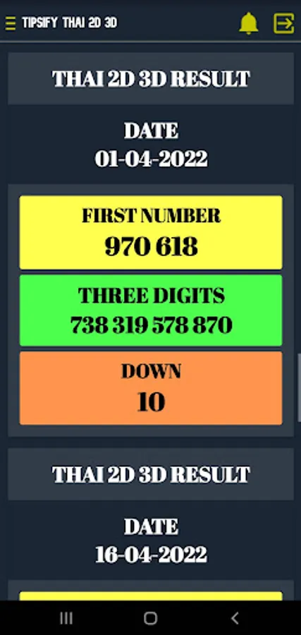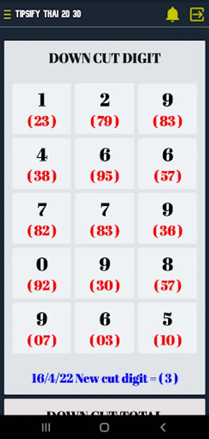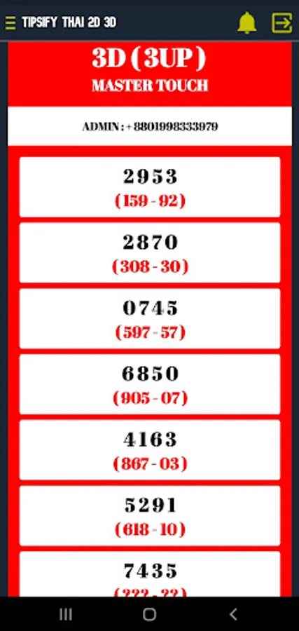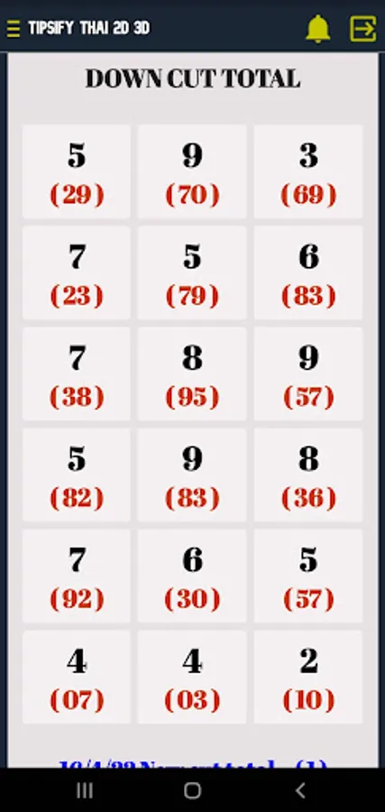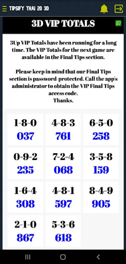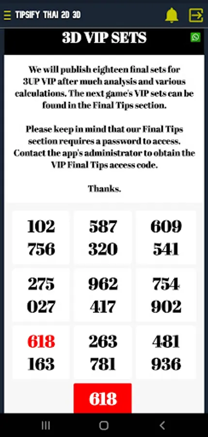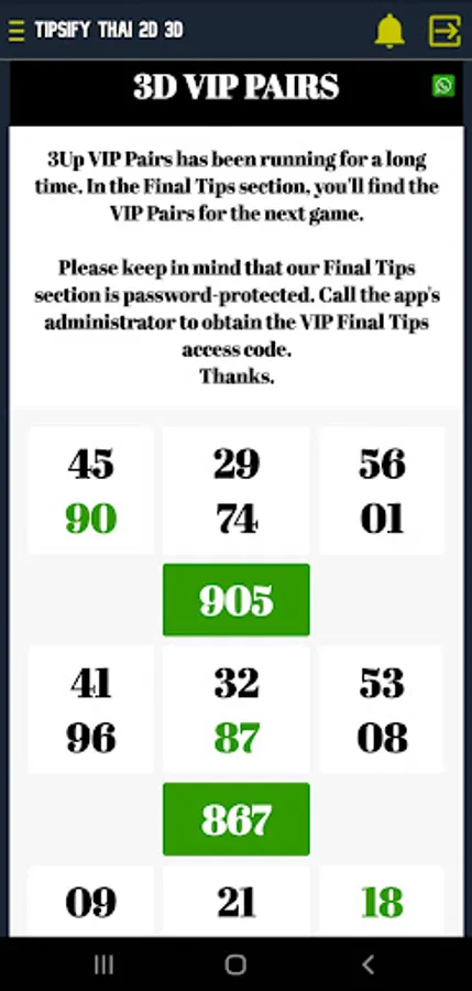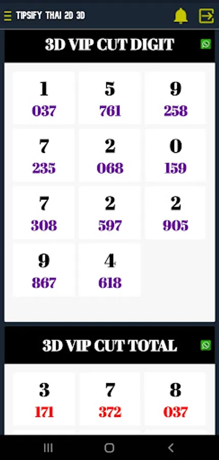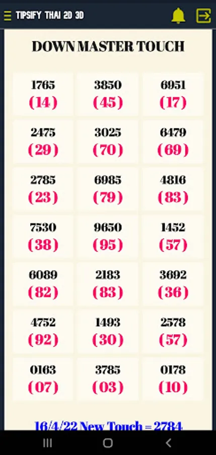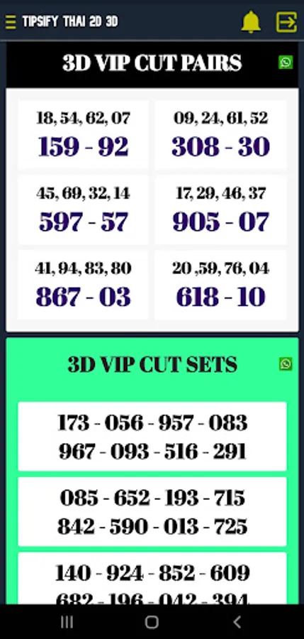 Touch, Total, Pairs, Single digits, Cut digits, Strong Totals, Cut Totals, VIP Sets, Cut sets, VIP Final tips, and so on are only applicable to Thai 2D and 3D (3Up & Down) games.