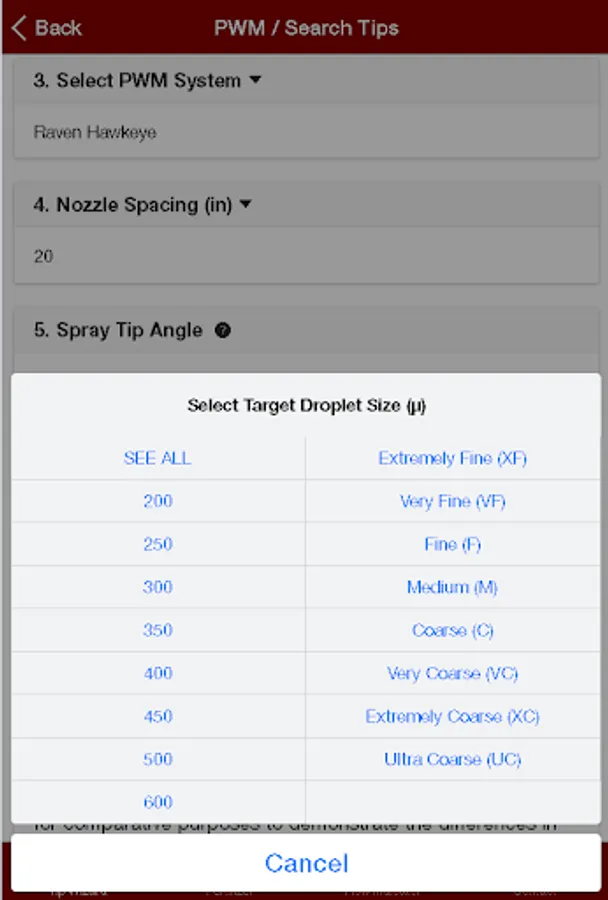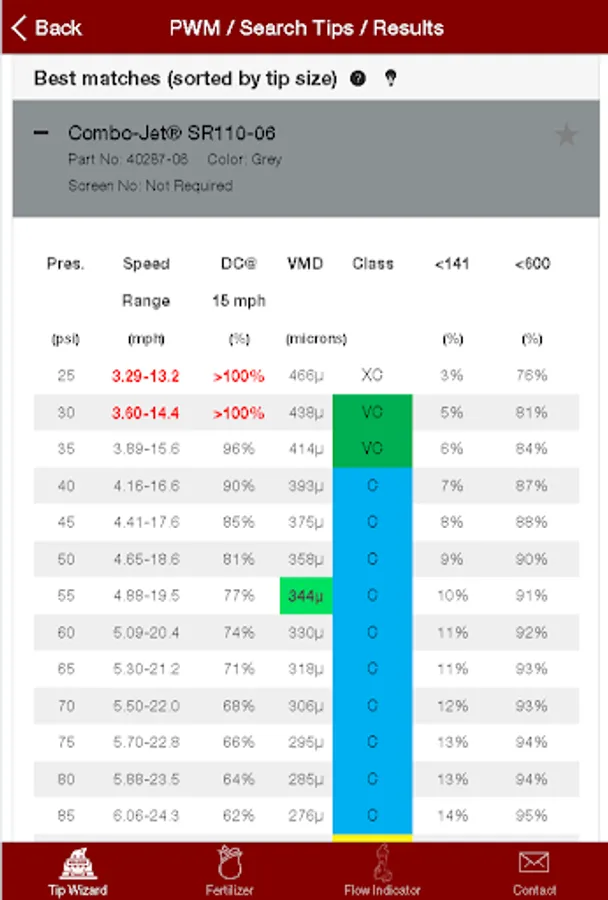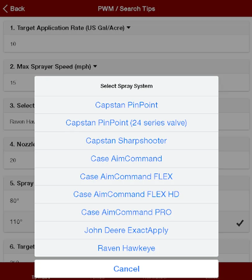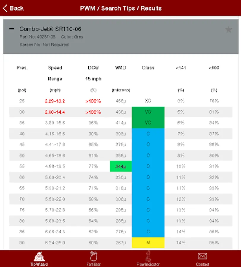 Pulse Width Modulation technology, which is becoming more prevalent for agricultural spraying, is also included within Tip Wizard's searches, making it once again easier to pick spray tips dedicated for that system. It shows the effective PWM duty cycles at any speed, allowing much easier decisions to be made with tip size on a PWM sprayer.