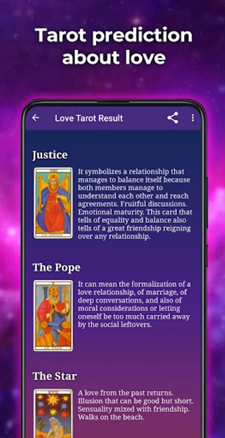 At your availability the strength of the 22 major arcana, all interpretations are personalized and will be adjusted to your queries. You will have to do the print run and you will be able to read the reading and the meaning of each card.