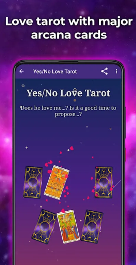 ❤ ️ Love Tarot Yes or No Choose 3 cards from the major arcana and depending on the connotation of the cards that come out, the answer will be positive or negative. You can ask yourself questions about your partner, your ex or your future in love.