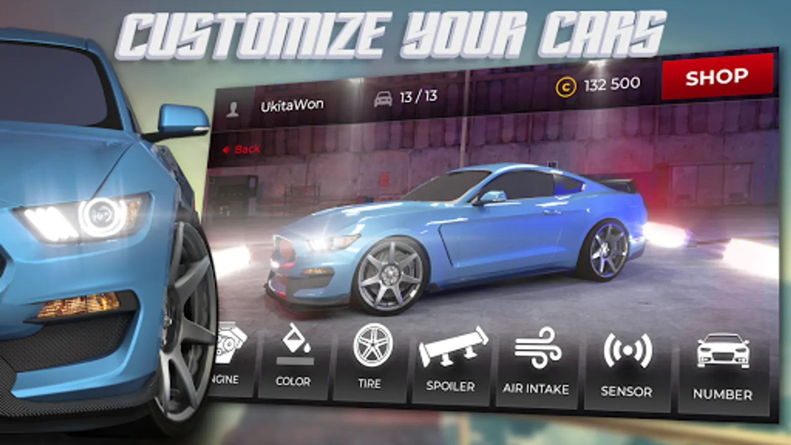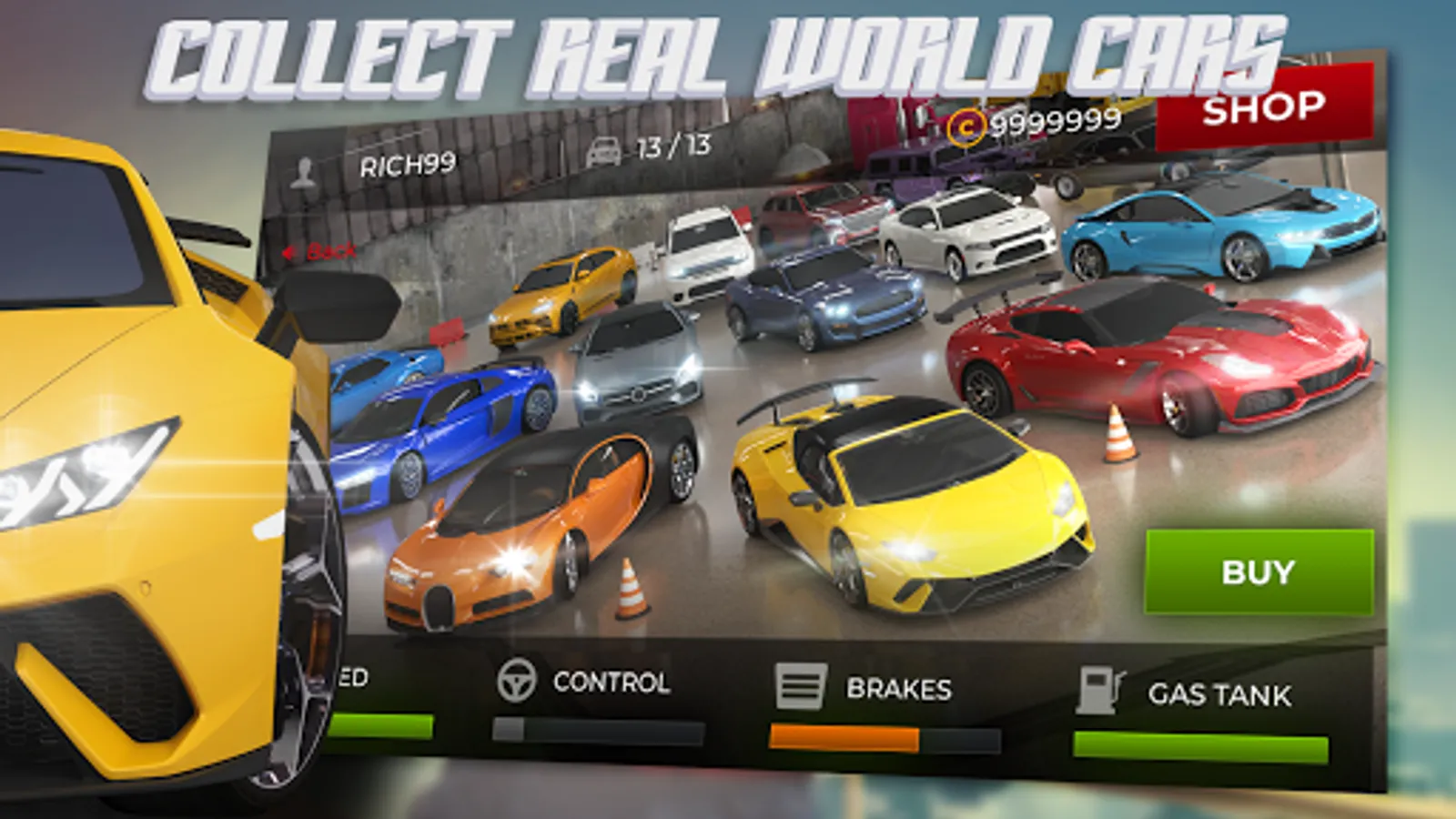 Customize your dream car in your garage. Improve with new rims, roof scoops and spoilers. More than +15 different super cars are waiting for you to add in your garage.