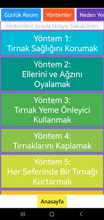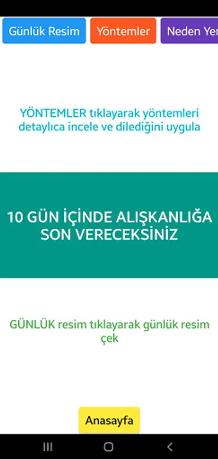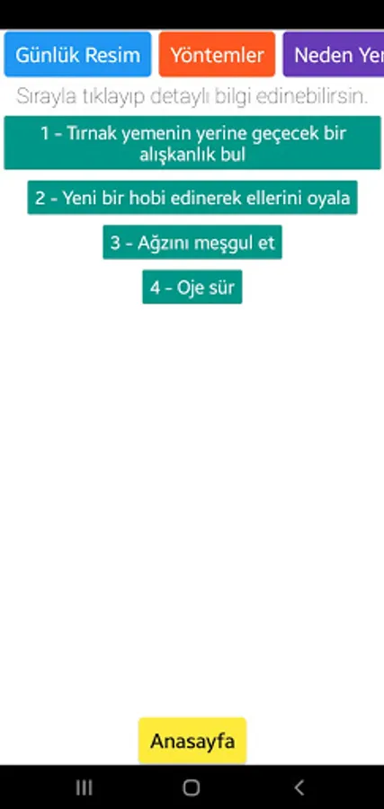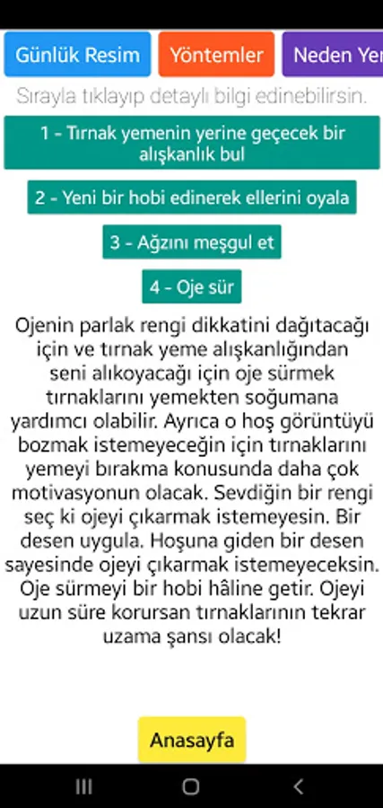 Nail biting is a big problem that many people have experienced for years. Thanks to our application, you will learn about more than one method by which you will stop biting nails. In the application, you will take pictures and upload them daily. You will upload two pictures as right and left hand fingernails daily and you can compare this with the pictures of the previous day in the following days. You can also heed the warnings. It is purely for informational purposes. You will be able to use the application without internet. Download the app and end this habit.