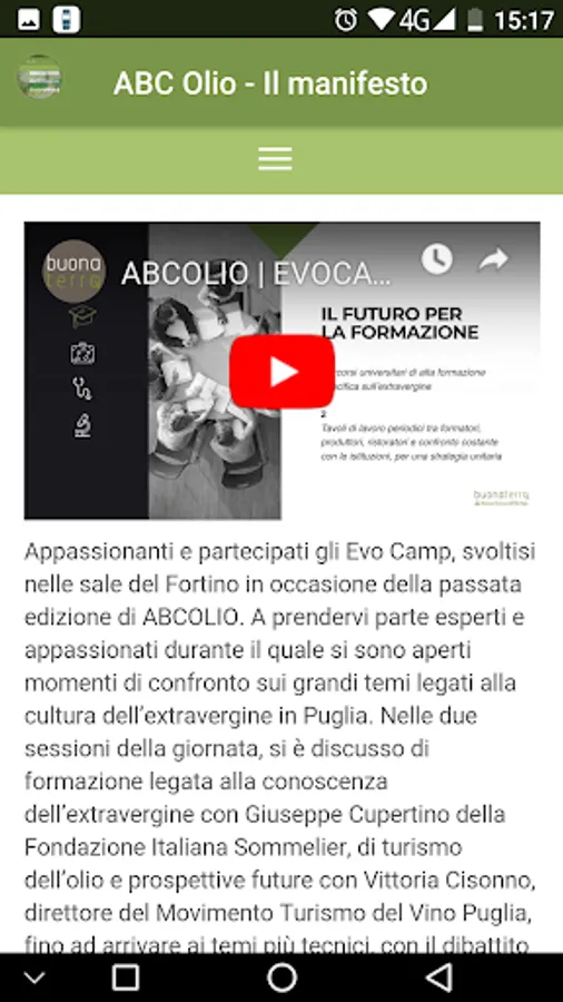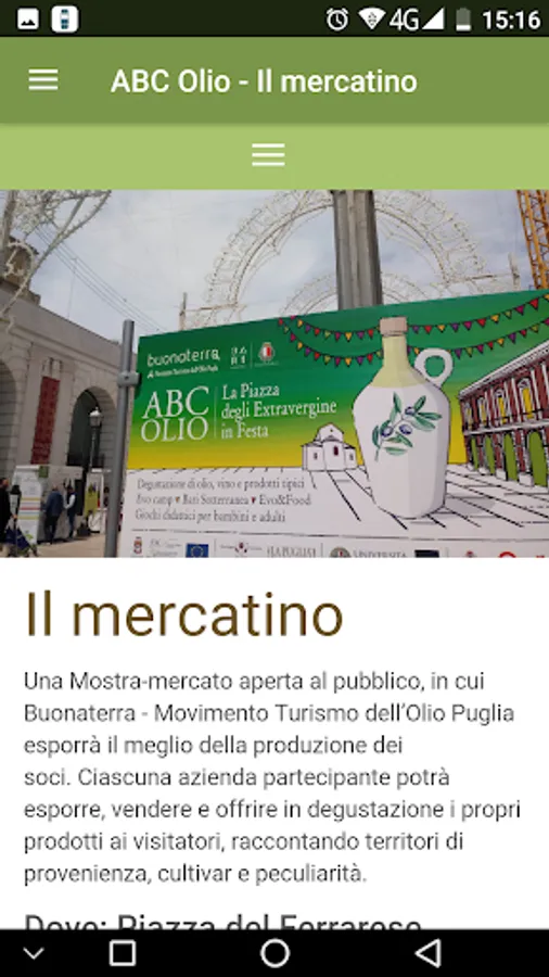 Every year the ABC OLIO event takes place in Puglia to discover all the qualities of this precious food through workshops, games, educational exhibition, market and meetings with experts. This app is a summary.