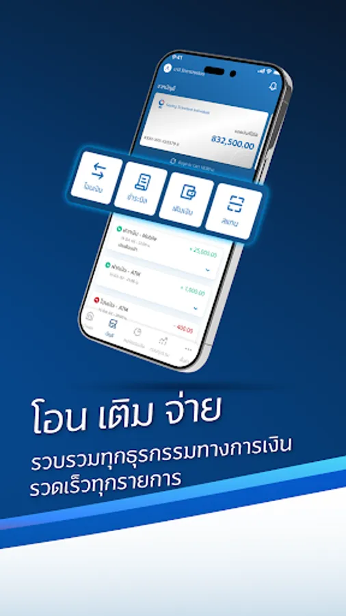 - Internal transfer, Inter-bank transfer, via account number, PromptPay or e-Wallet.