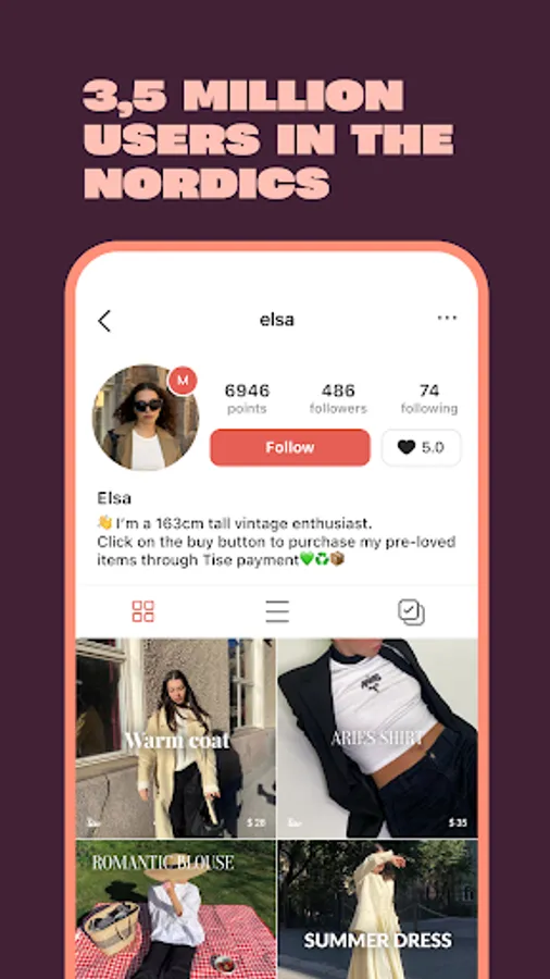 We are the largest community for buying & reselling second hand fashion in the Nordics, with millions of Tisers in Norway, Sweden, Denmark and Finland. Together we can make a positive impact on the planet!