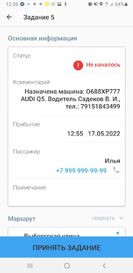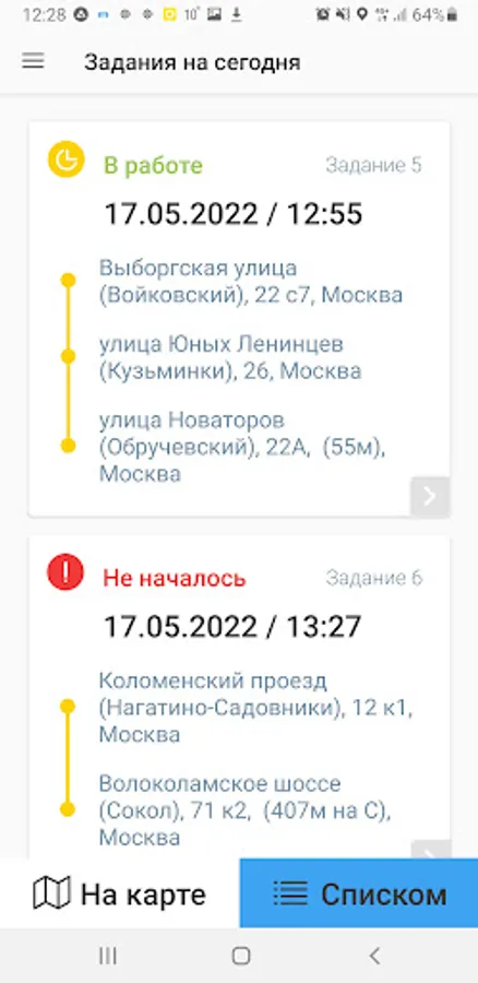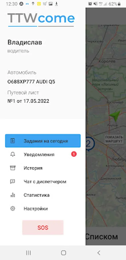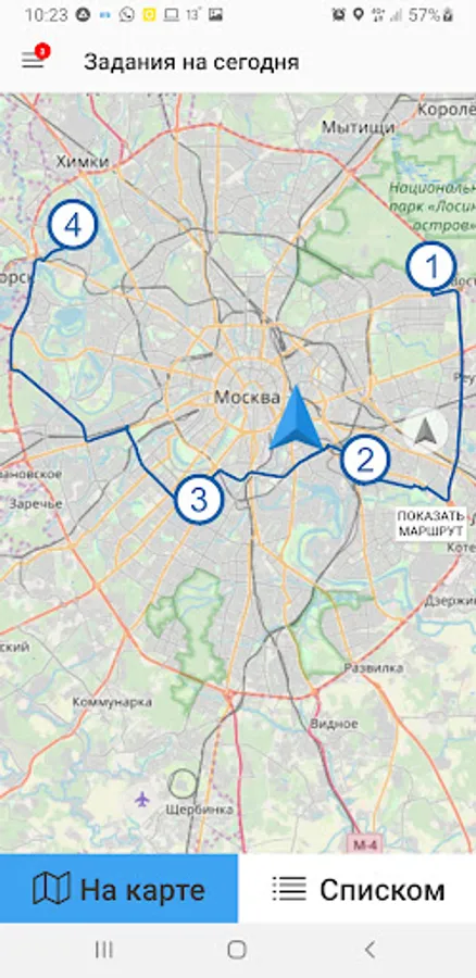 The location of the driver and all routes assigned to him tasks are displayed on the map.