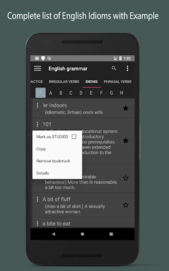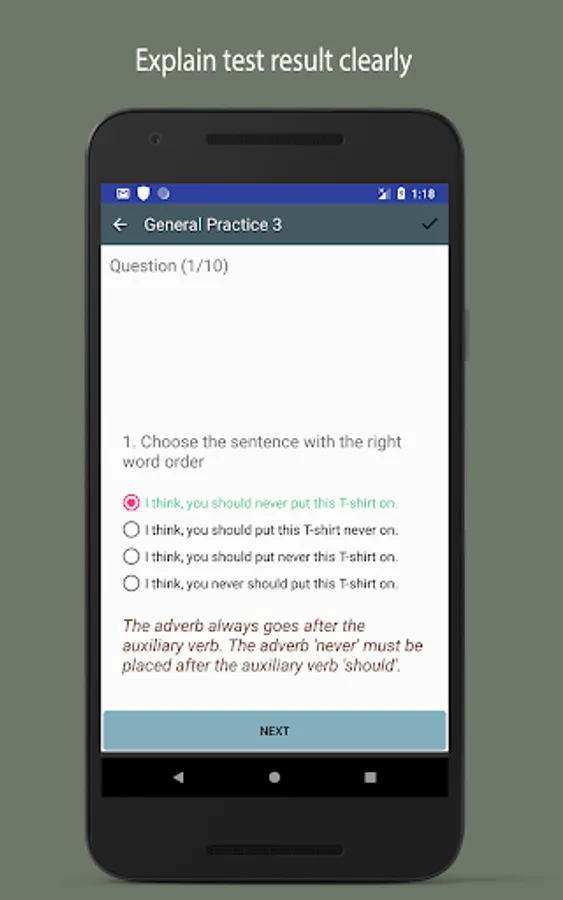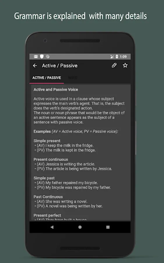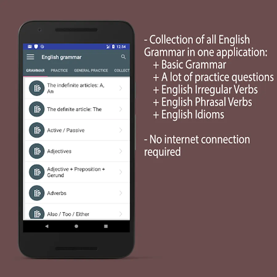 The application contain many test question with answer description. Very useful to understand the grammar.