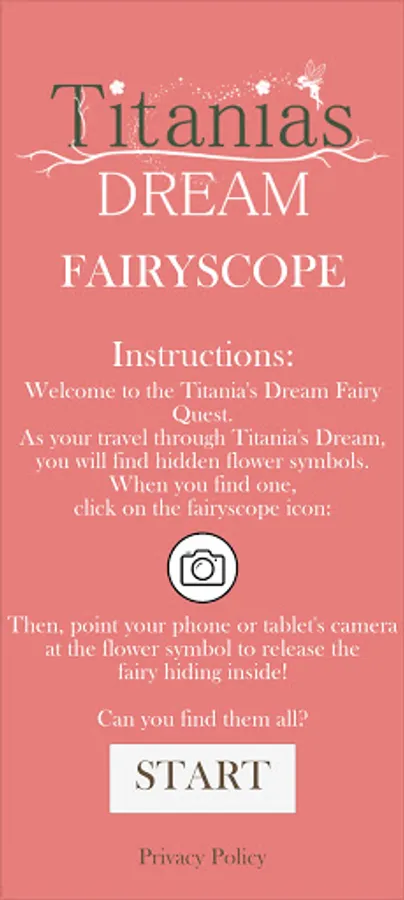 Titania’s Dream Fairyscope is the official augmented reality companion app to ‘Titania’s Dream’. Use this application as part of the 'Titania's Dream' live experience to search for hidden fairies in the enchanted forest.