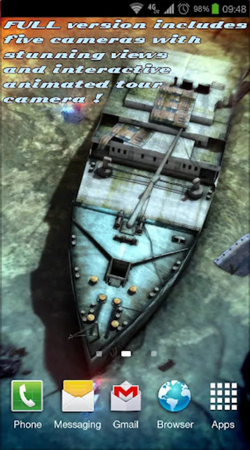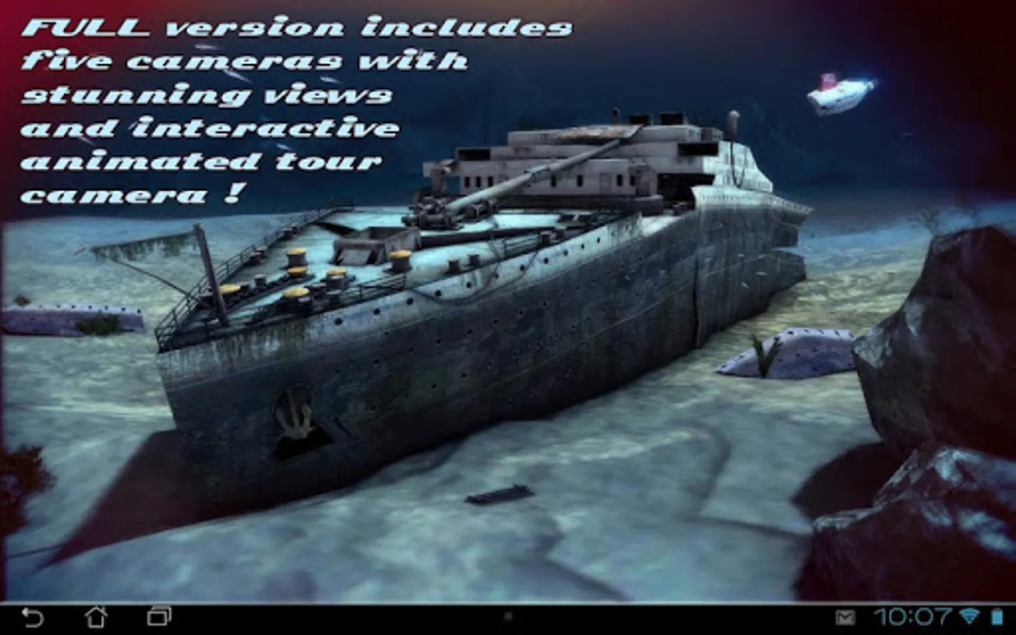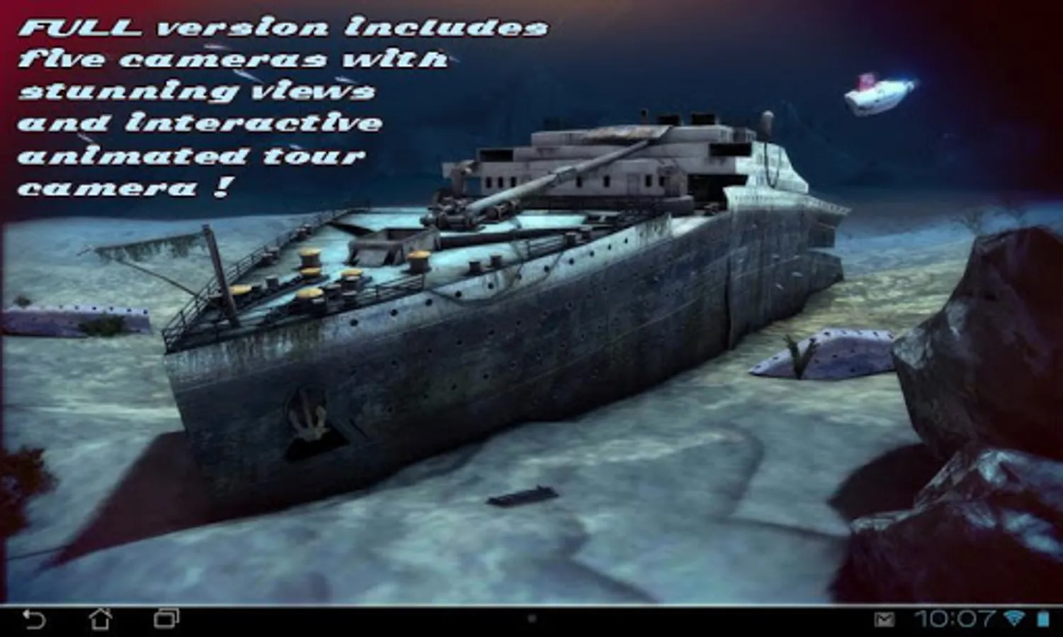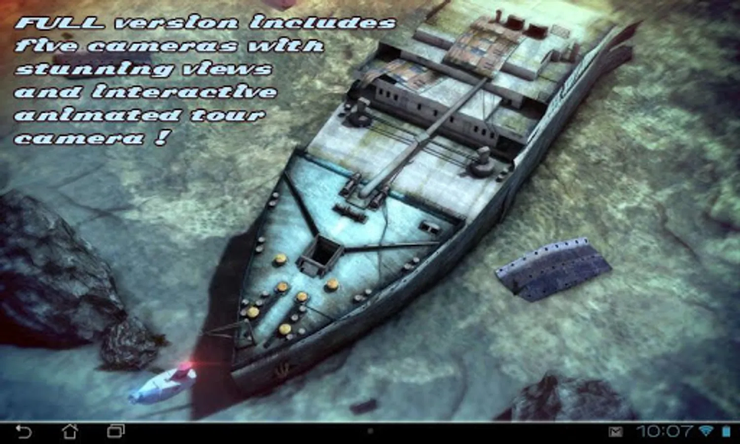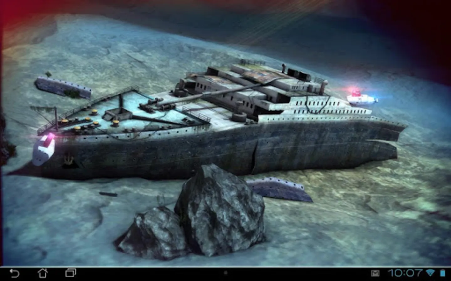Realistic fully 3d scenery of Titanic resting at the bottom of the ocean! The most famous and mysterious ship known in human history now right on the screen of your phone! Naturally animated swarms of fishes, high definition underwater relief make this scene absolutely photo real! Modern scientific submarines are exploring Titanic at depth of about 3800 meters, so why not to join them and learn precisely re-created wreck of the most tragic, but romantic ship?