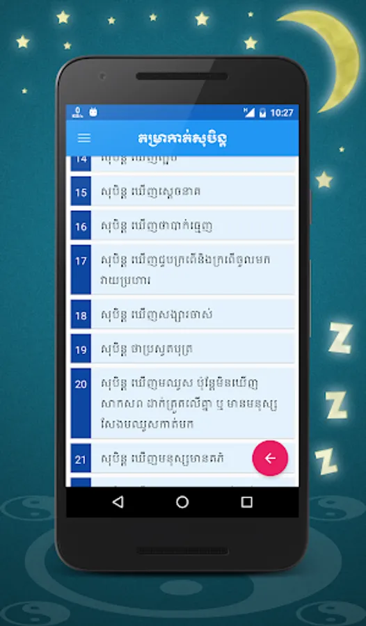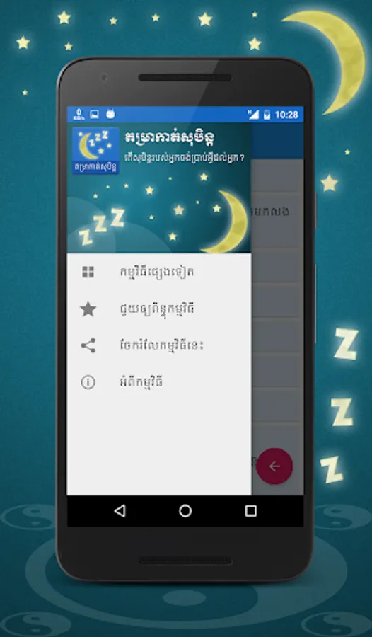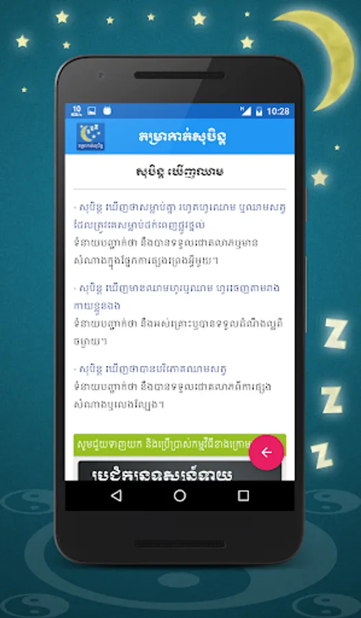 This app will help you to find out what's the meaning of your dream last night. The Khmer people believe that a dream always has it's own meaning something it is good sometime it is bad. This app has a lot of dream categories and you will find one for you as well as your dream meaning.