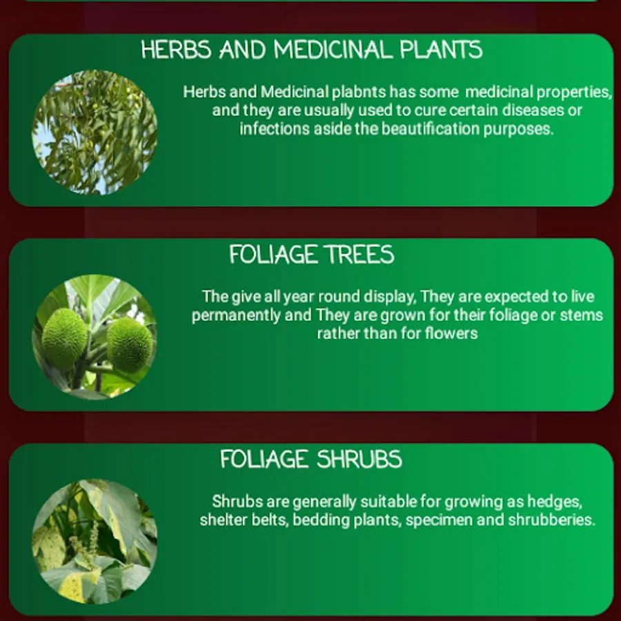 This App is intended as a resource material for students and teachers. It is to aid them in their studies of Floriculture, Environmental Horticulture and Landscape Design Programmes.