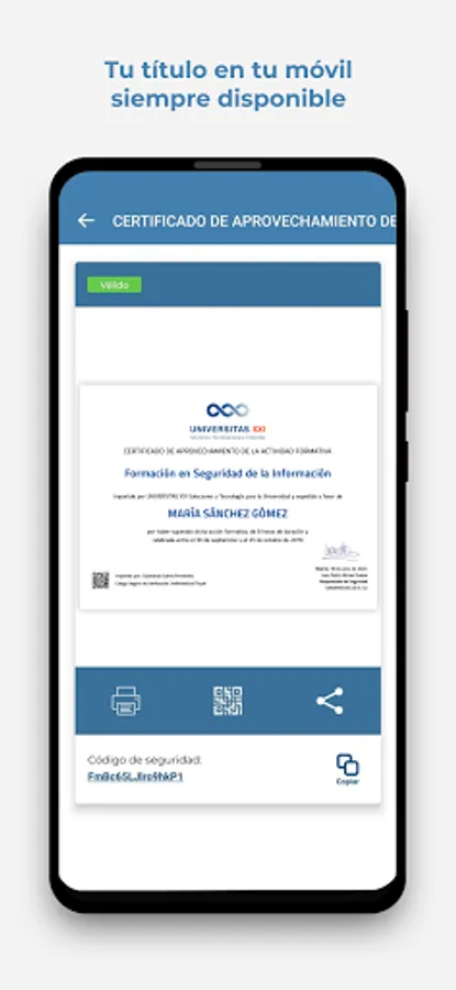 Now you can accredit your studies to anyone without the need for travel or verification costs and with absolute security because your University will validate your diploma online.