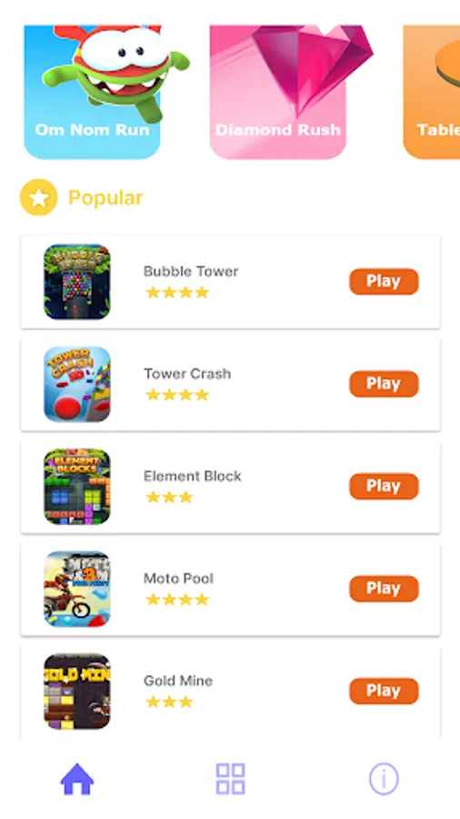 Free kick game, Diamond rush, Table tennis, Archery, Om num run, 8 ball classic, Bubble tower, Tower crush, Element block, Moto ball, gold mine